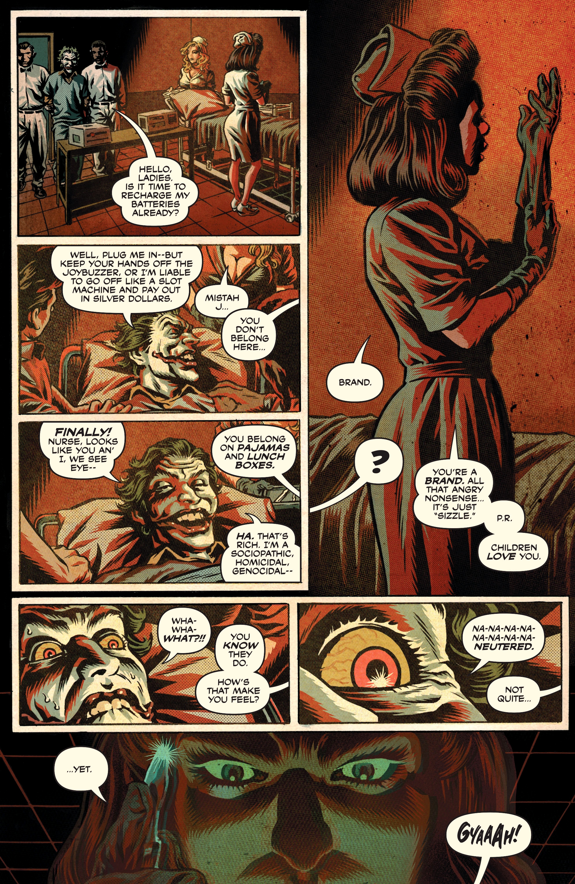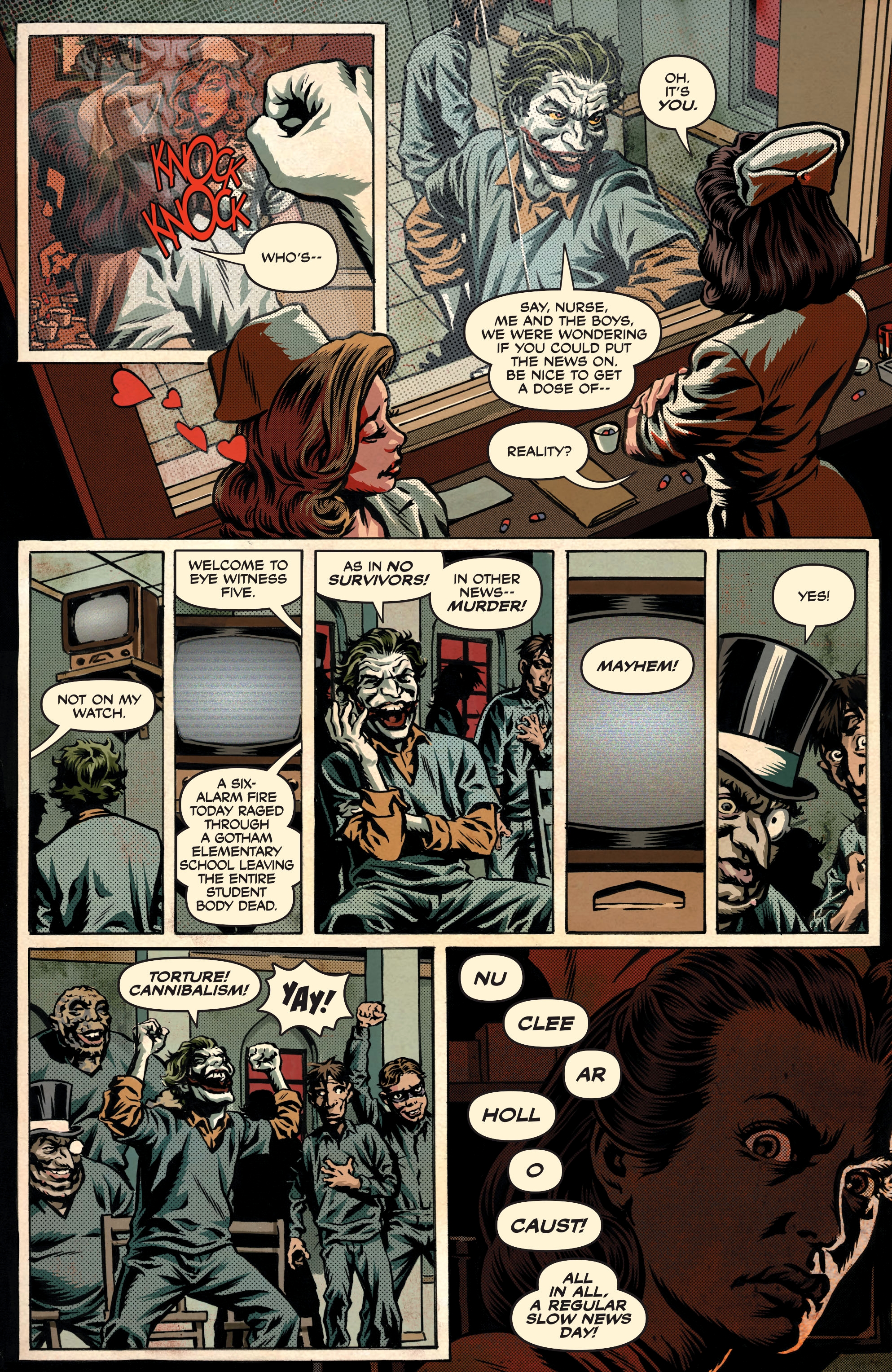 Джокера любят дети, на его органах можно неплохо заработать, чем решили воспользоваться санитарки. Клоун уже испугался, что его кастрируют, но пока нет. Просто лоботомия. А вот Бэтса лиши достоинства, нехрен было светить пенис в комиксе Batman: Damned от того же Аззарелло.