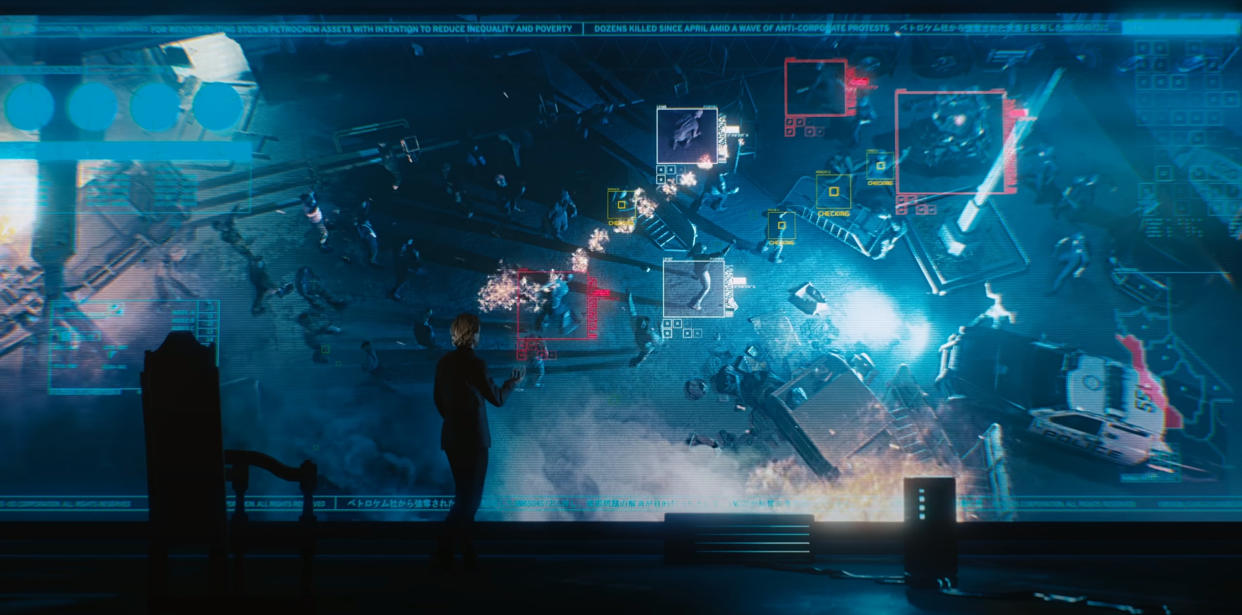 У сцены с самых первых скриншотов нет концепт-арта, зато точно такие же грабители и очень похожая лавка появляются в геймплейном ролике, рассказывающем о принципах работы брейнданса. Им снова не везет, но теперь с грабителем разбирается не владелец магазинчика.