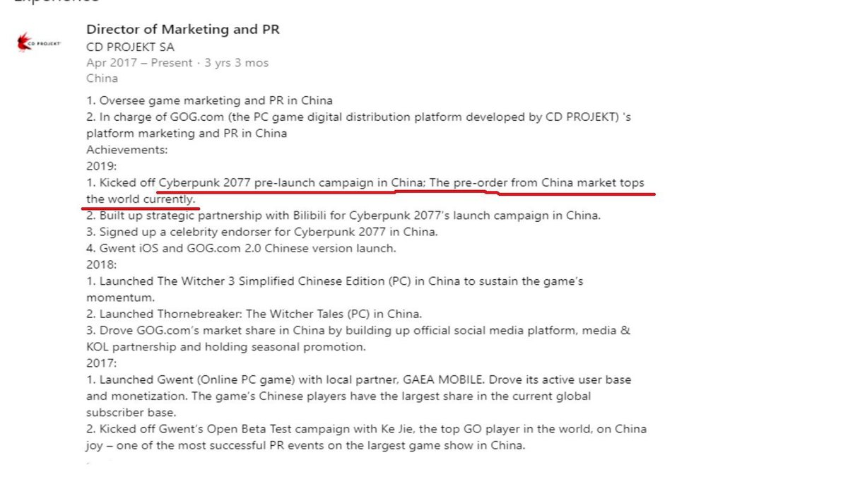 О популярности игры на китайском рынке сообщает и PR-директор локального подразделения CD Projekt. На странице менеджера в LinkedIn сказано, что Cyberpunk 2077 активнее всего предзаказывают именно жители Китая.