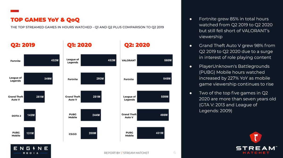 По сравнению с тем же кварталом 2019 года количество времени, потраченного на просмотр стримов по Fortnite, выросло на 85%, у Grand Theft Auto V прирост составил 98%. Тем не менее, игры заняли в топе более низкие места.
