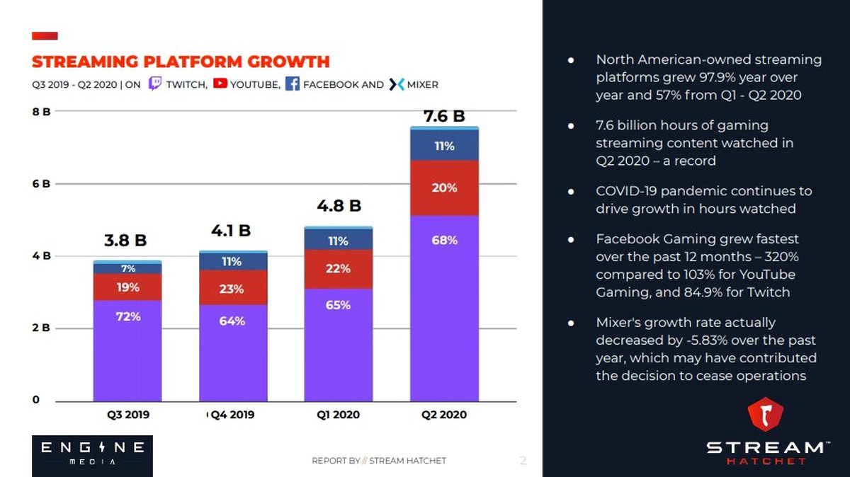 Во втором квартале зрители провели за просмотром стримов 7.6 миллиарда часов; в первом квартале эта цифра составляла 4.8 миллиарда часов. Самый большой прирост аудитории продемонстрировал сервис Twitch.