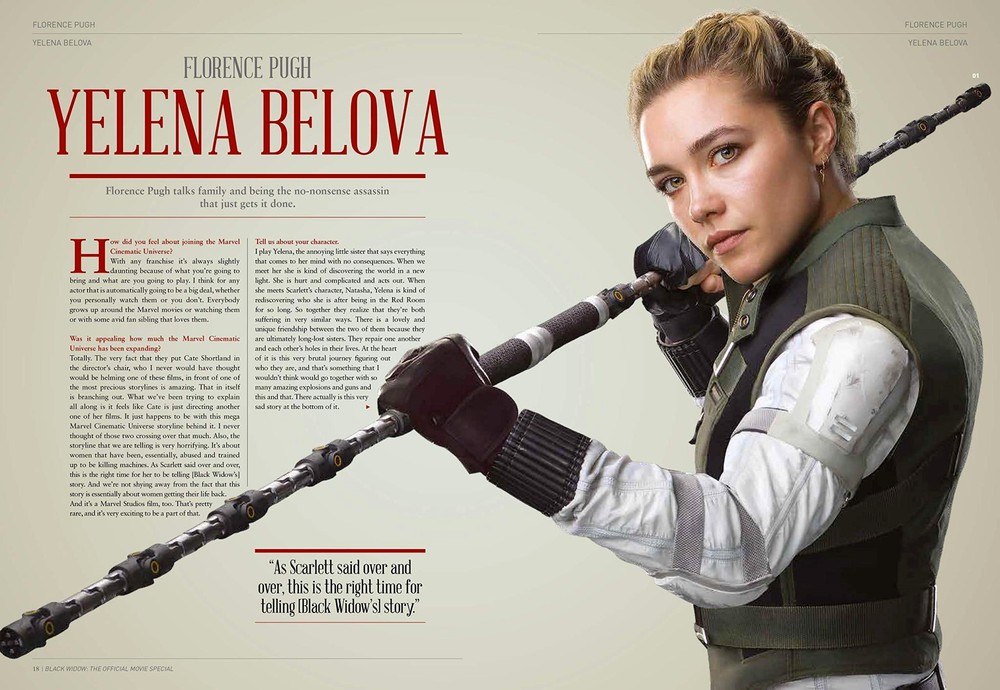 На превью книги можно рассмотреть Скарлетт Йоханссон в новом костюме Черной Вдовы и Флоренс Пью, играющую Елену Белову, старую подругу Наташи Романофф. Еще одна страница посвящена Таскмастеру: здесь показан его костюм без спецэффектов.