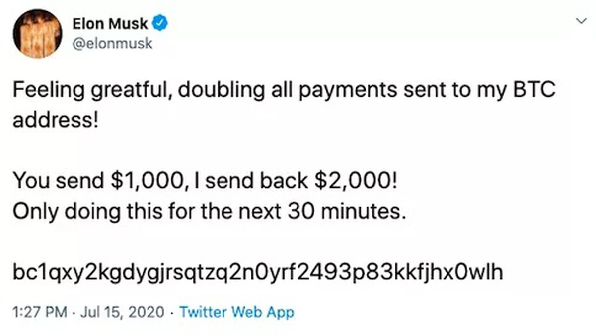 Вечером 15 июля эксцентричный руководитель Tesla Илон Маск опубликовал твит, в котором предложил пользователям слать биткоины на его кошелек. В следующие 30 минут Маск обещал выслать полученную им сумму назад в удвоенном размере.