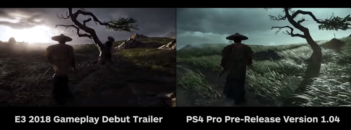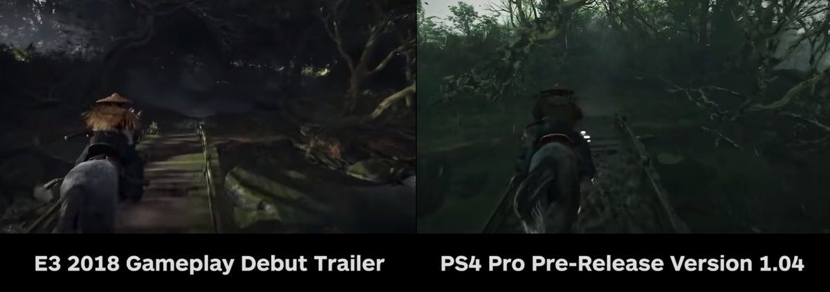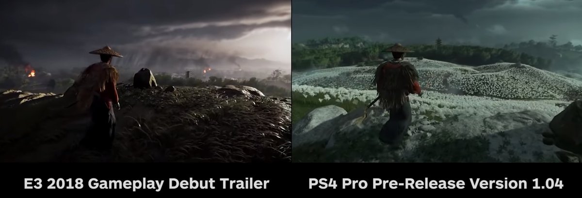 Возможно, снизилась дальность отрисовки и сложность атмосферных эффектов, но точно сказать сложно. В Ghost of Tsushima динамическая погодная система, может быть, для съемки реального геймплея просто был выбран неудачный момент.