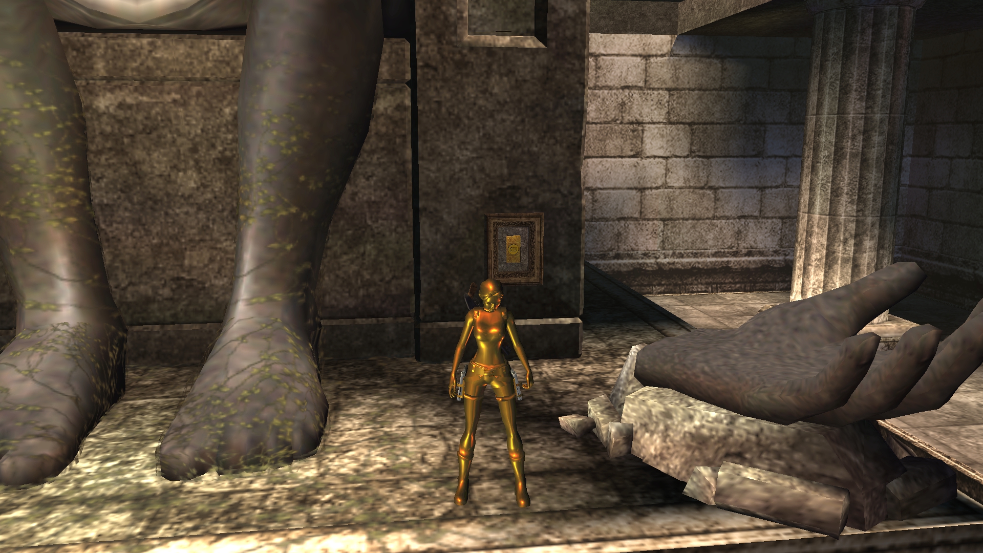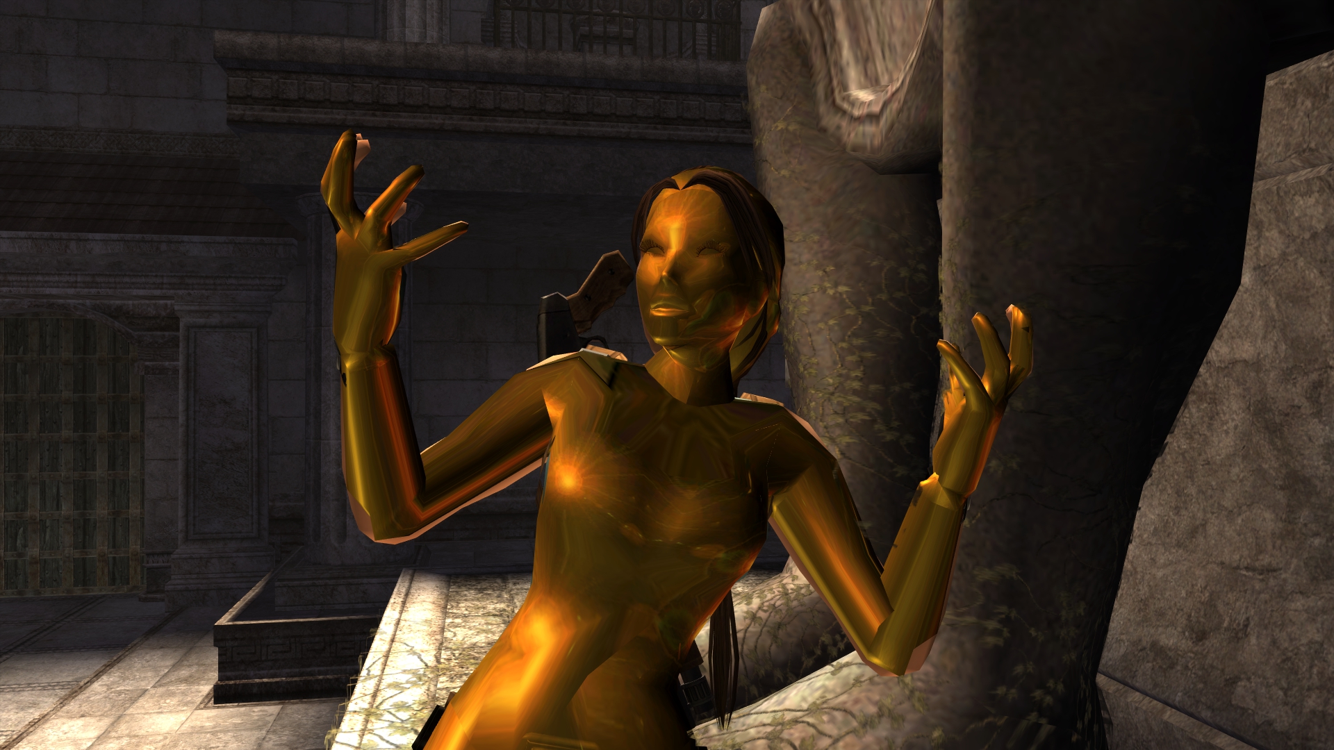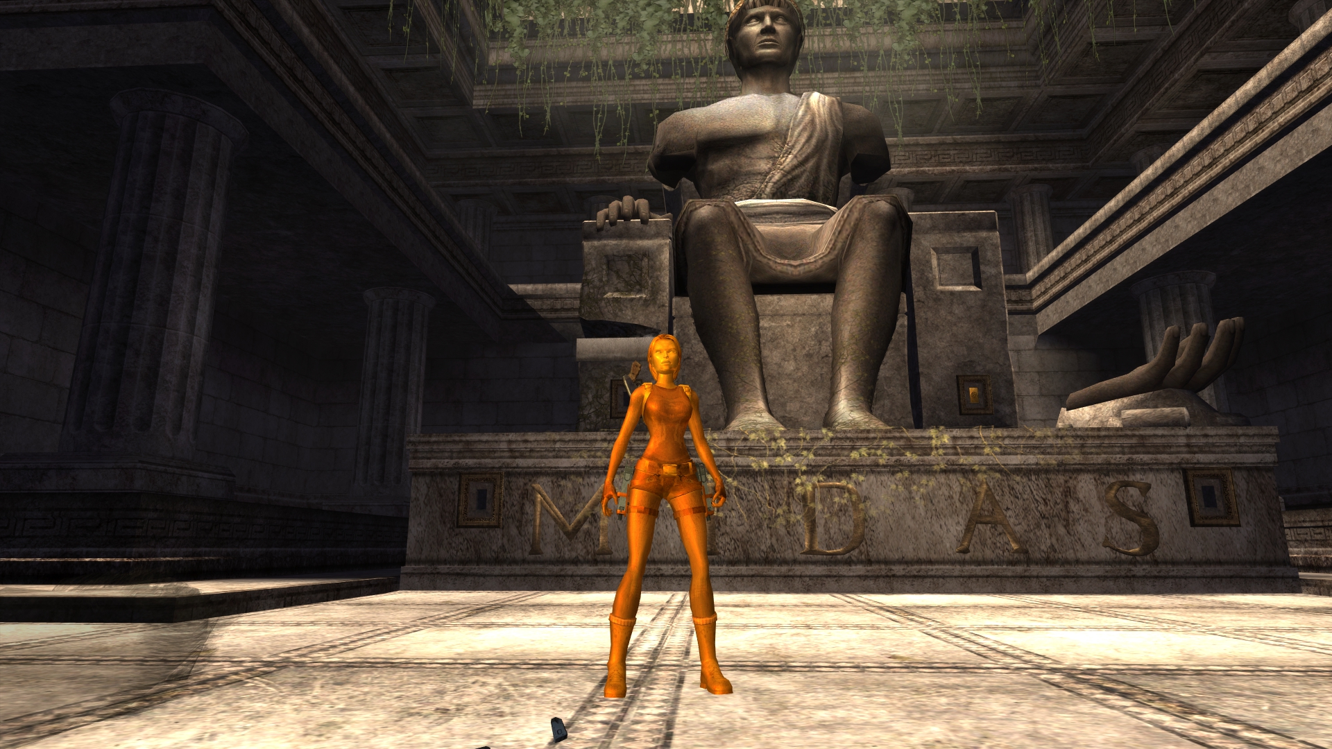 Но, как и с прошлым костюмом, во всех остальных версиях костюм исправили. На примере версии для PSP вы можете видеть, что костюм ничем не отличается от того, который получается, если встать на руку Мидаса. Более того, было исправлено выражение лица Лары в тот момент, когда она была обращена в золото. Впрочем, о PSP-версии мы поговорим в следующий раз.