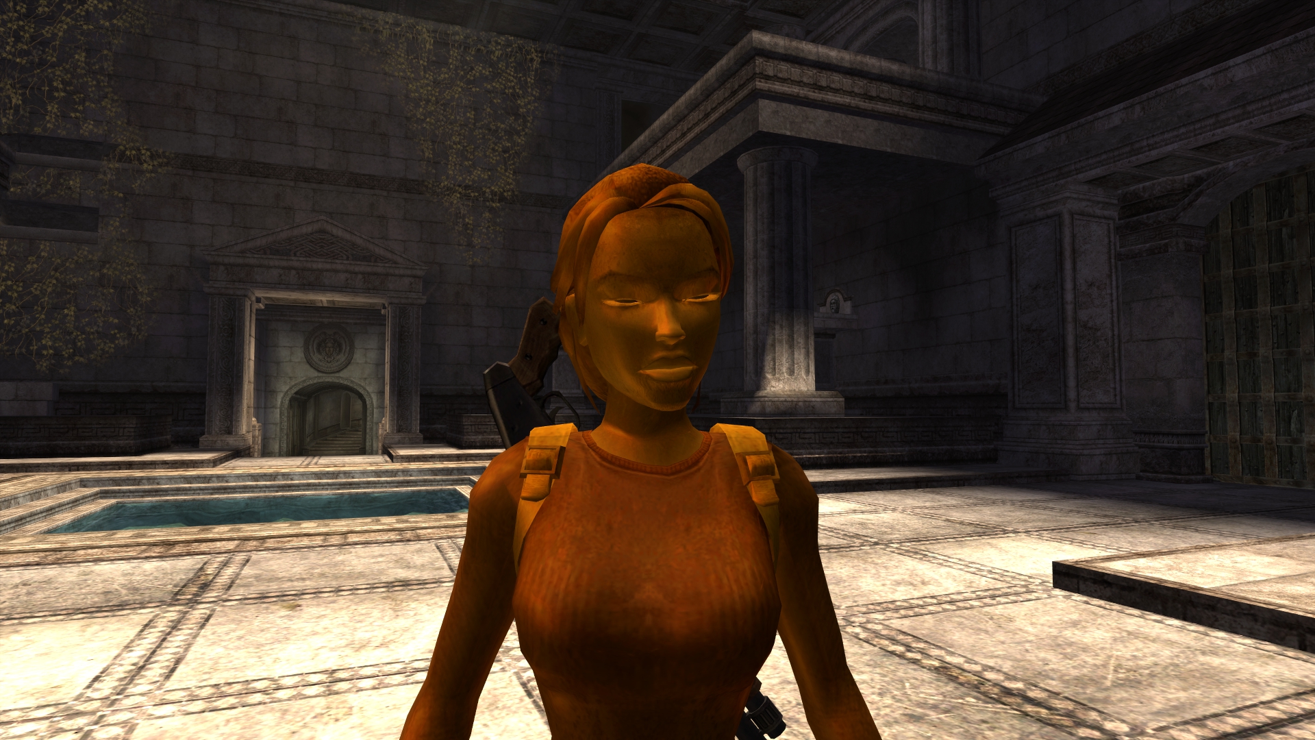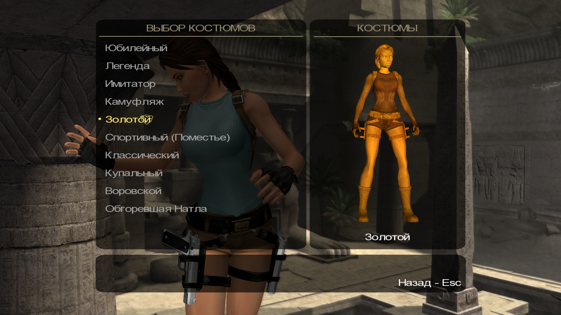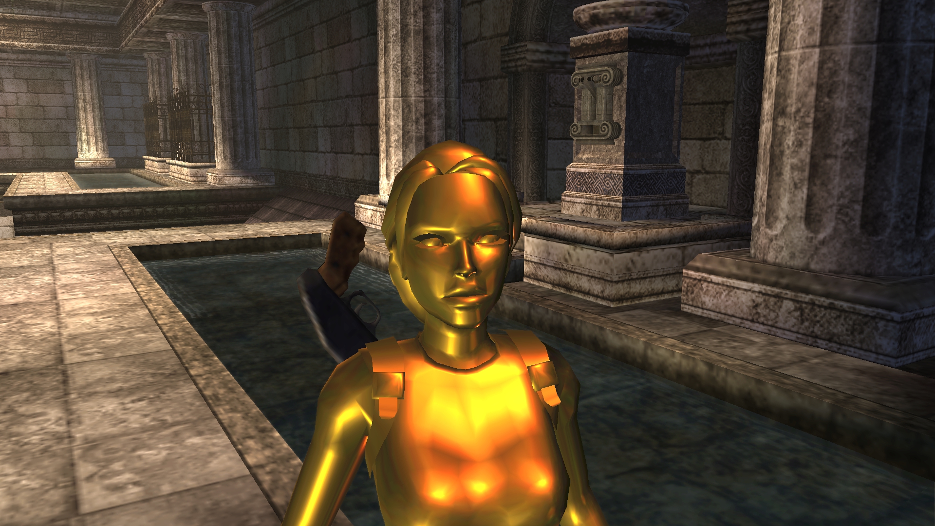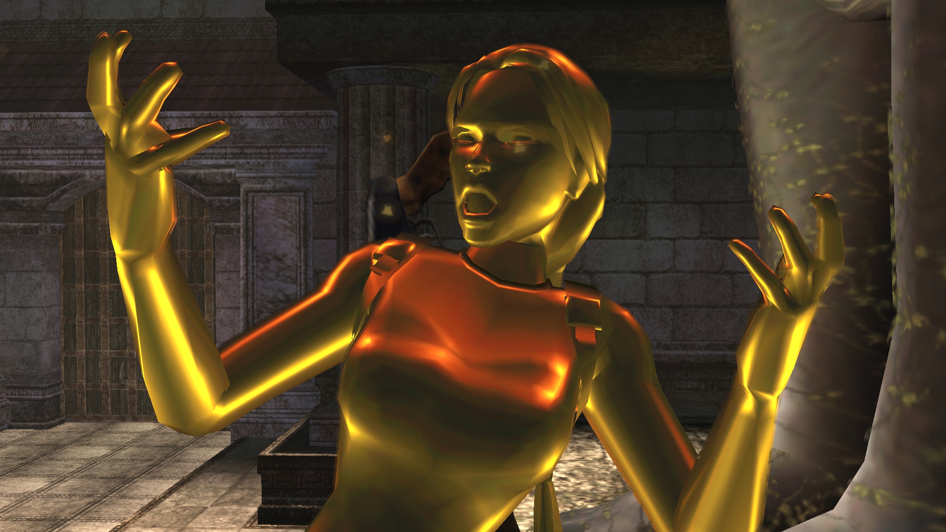 Но, как и с прошлым костюмом, во всех остальных версиях костюм исправили. На примере версии для PSP вы можете видеть, что костюм ничем не отличается от того, который получается, если встать на руку Мидаса. Более того, было исправлено выражение лица Лары в тот момент, когда она была обращена в золото. Впрочем, о PSP-версии мы поговорим в следующий раз.