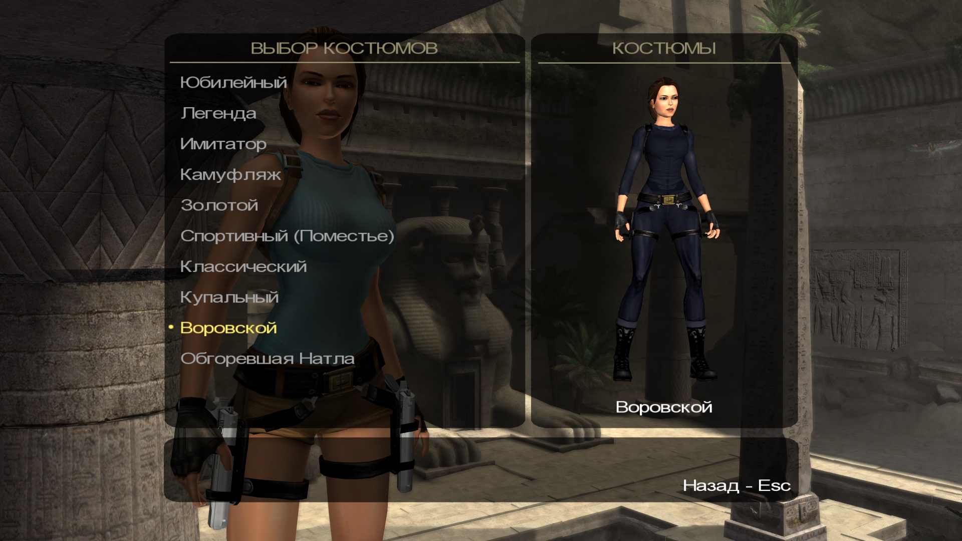 4. Костюм воровки. Насколько я знаю, появился он впервые в Tomb Raider Chronicles и используется в играх по сей день (в качестве платных DLC, само собой). Однако в версиях от июня 2007 года (PC и PlayStation 2) костюм в галерее и костюм в самой игре – два разных по цвету и оформлению костюма. В оригинальном исполнении костюм должен быть чёрного цвета. Так оно и есть, но лишь в галерее просмотра моделек. В игре цвет костюма меняется на бежевый. Изначально я думал, что это из-за освещения или отражений, но когда снизил графику до минимума и ничего не поменялось, то понял, что костюмы просто-напросто разные.