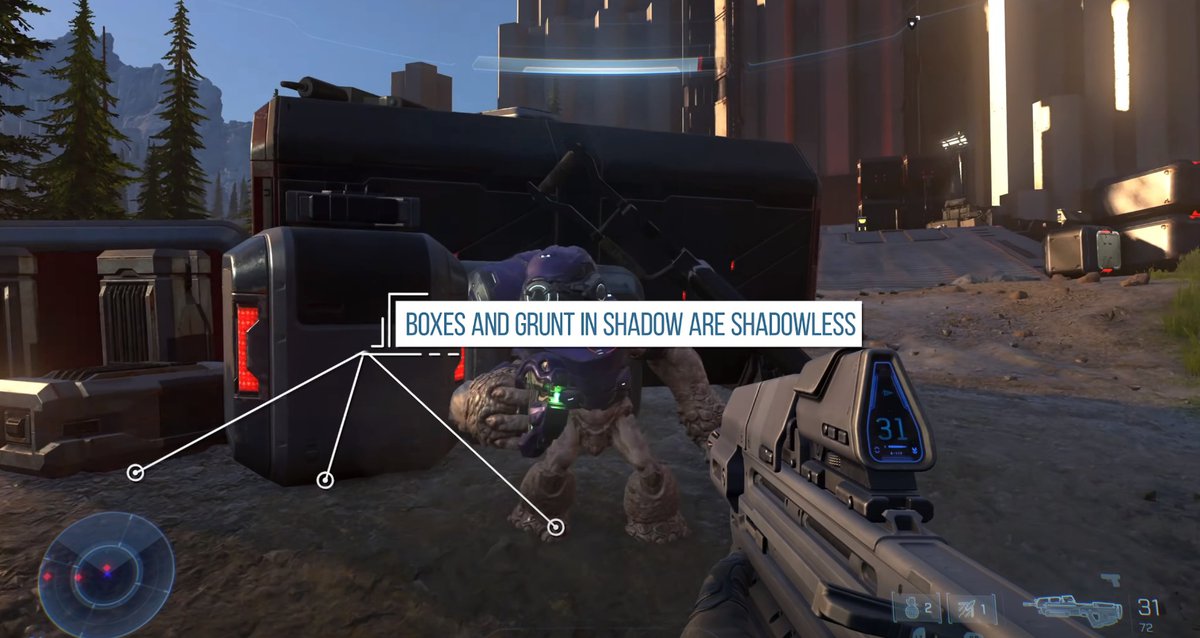 Уровень, показанный в геймплее Halo Infinite, спроектирован так, что персонаж почти всегда оказывается вне прямого солнечного света — в тени. Полностью реалистичное глобальное освещение обеспечило бы реалистичные мягкие тени, но его в игре нет.