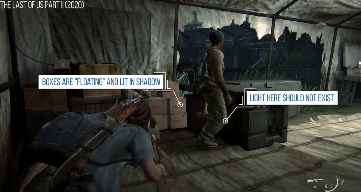 The Last of Us 2 — яркий пример игры с хорошим статичным освещением. Но по динамическим объектам можно догадаться, что оно именно статичное: игра не может осветить их так же реалистично.