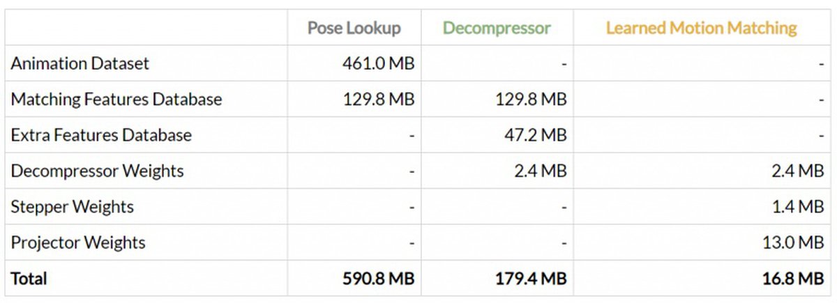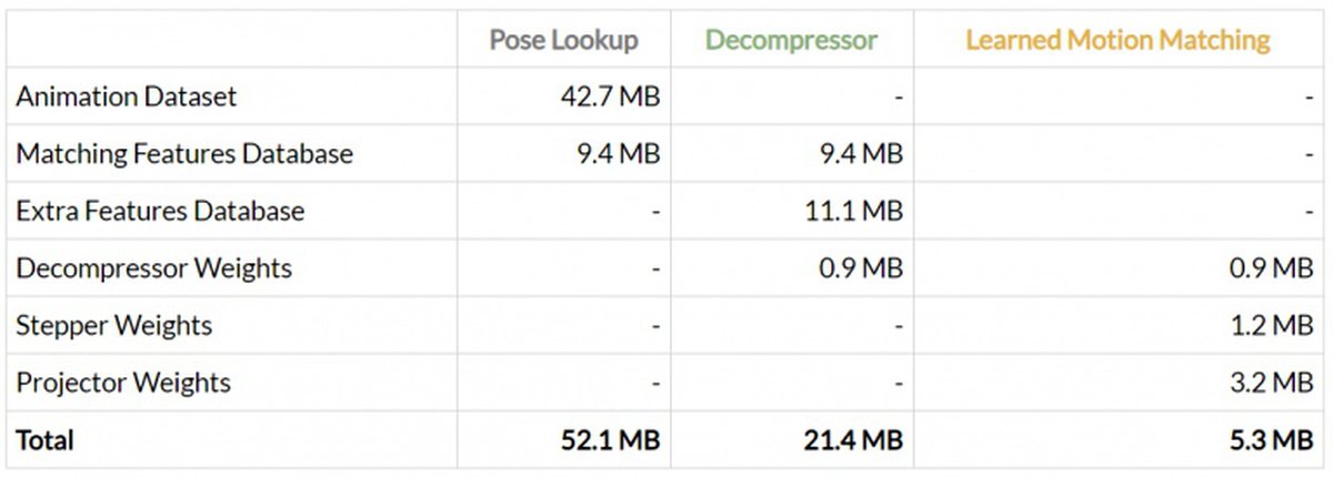 Со старой системой такой набор анимаций требовал 590 мегабайт памяти. Новая система уменьшила его примерно в 34 раза, до 17 мегабайт — этот объем занимали нейронные сети, в реальном времени генерирующие все нужные данные.