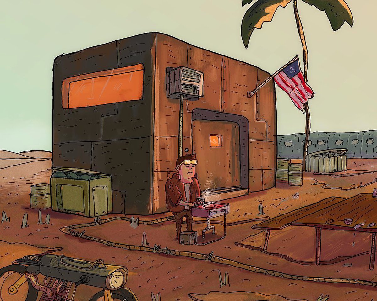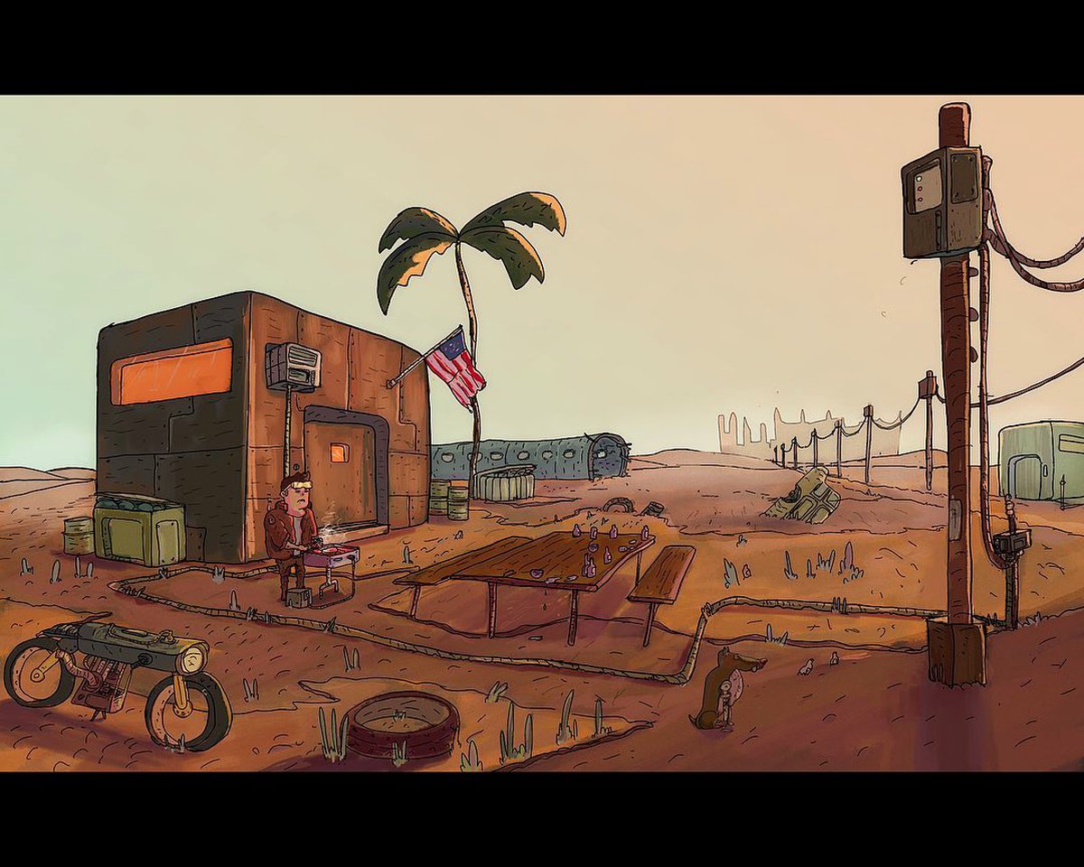 Похоже, кадр с барбекю в пустошах это отсылка к лаконичному скриншоту игры. Сильверхэнд у Юри получился ужасно беззаботным, а собачки в его версии Найт-Сити, похоже, тоже не гнушаются аугментациями (на самом деле с животными в киберпанке все сложно).