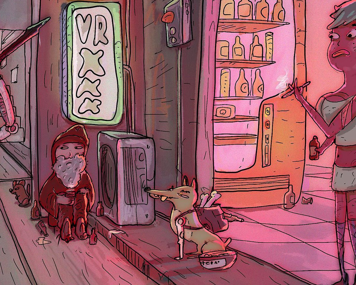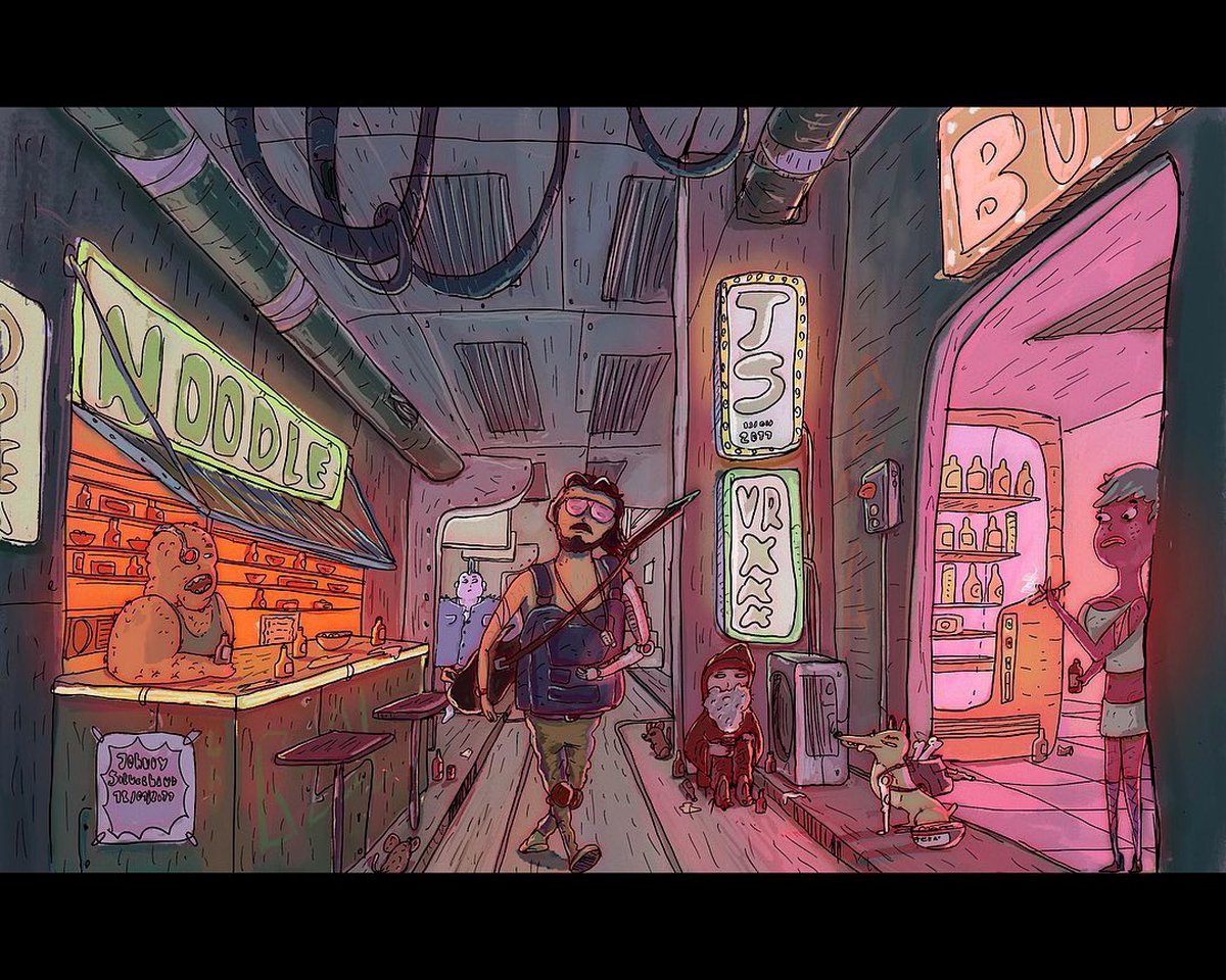 Бразильский художник Юри Квирино, работающий в довольно необычном мультяшном стиле, продолжает исследовать вселенную Cyberpunk 2077. Юри предлагает встретиться с Джонни Сильверхэндом, заглянуть в Пустоши и пройтись по улицам Найт-Сити.