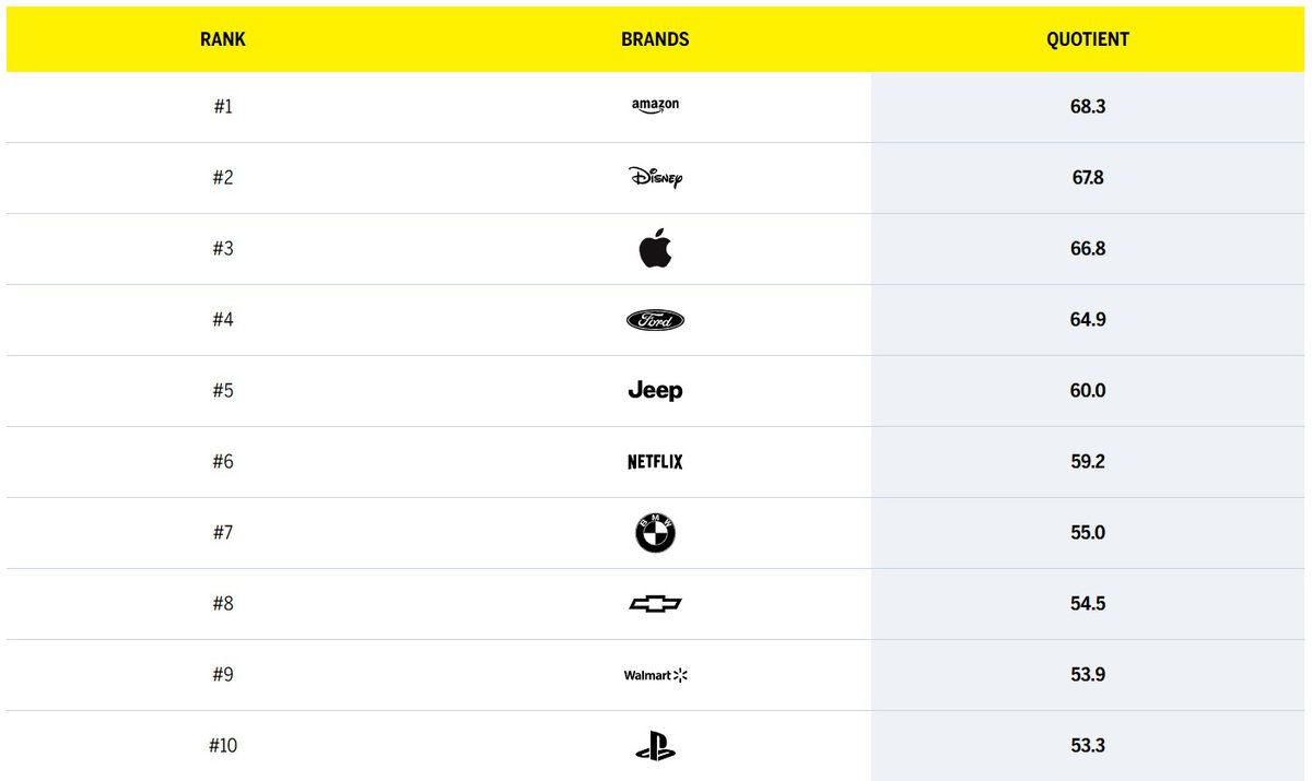 В абсолютном зачете, то есть в возрасте от 18 до 64 лет, лидирует Amazon. В топ-10 самых популярных брендов также входят Disney, Apple, Netflix, Ford, Jeep и Walmart. PlayStation попала на десятое место, у Xbox 14 строчка в рейтинге.