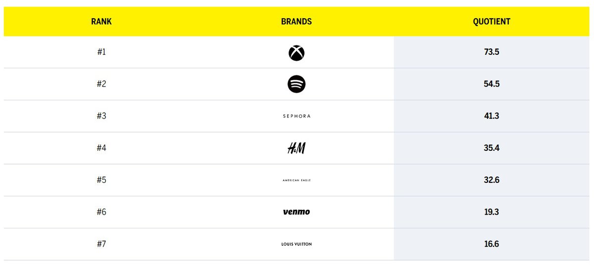 В этом возрасте на первое место выходит Xbox, других игровых брендов в топе нет вовсе. Впрочем, похоже, что у Brand Intimacy было недостаточно данных для анализа: в топ попало только семь брендов.