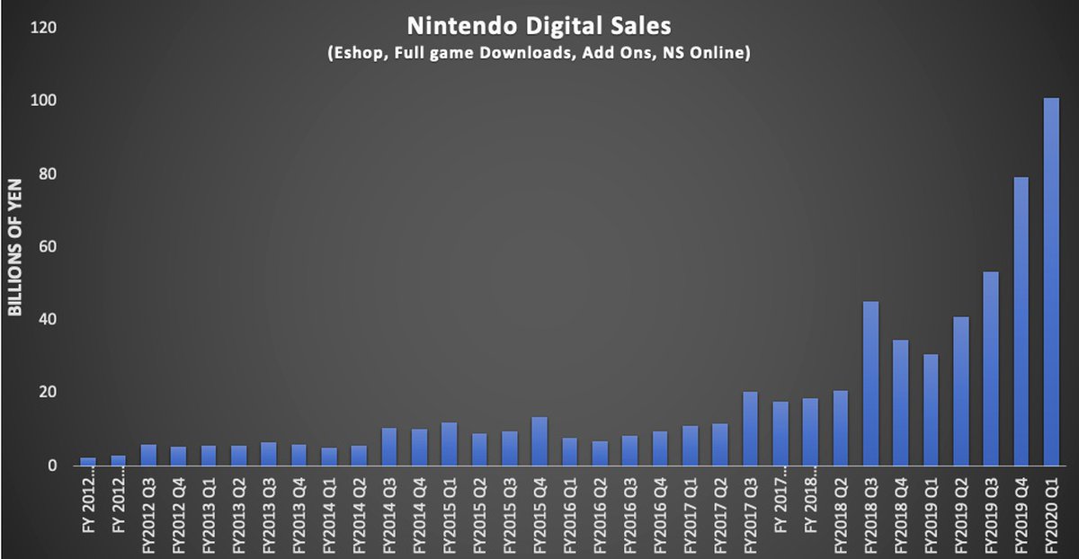 С конца 2019 года рост активизировался. Последние несколько кварталов Nintendo непрерывно ставит рекорды по цифровым продажам — а значит, получает большую прибыль. При распространении игр через ритейлеров компания делится с ними процентом с продаж, у игр, проданных в цифровой форме, этого не происходит.