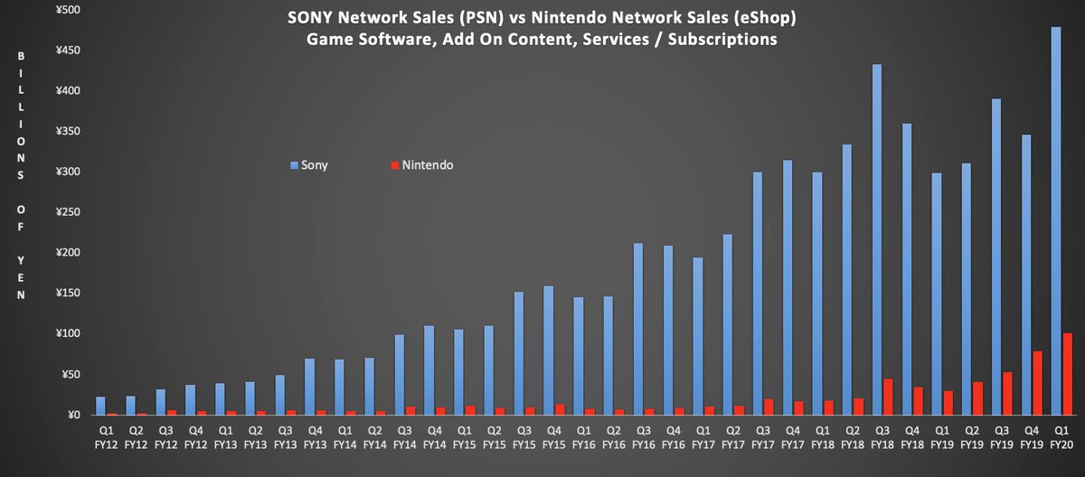 Старший аналитик Niko Partners Даниэль Ахмад изучил результаты компании за последние годы и пришел к выводу, что Nintendo постепенно превращается в корпорацию Sony. Десятилетие назад компания зарабатывала на продаже консолей и игр на физических носителях, но теперь все более важную роль играют цифровые продажи и дополнительный контент.