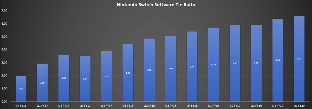На самом деле, отмечает Ахмад, этот показатель увеличивается почти все время, что Switch присутствует на рынке. Сейчас каждый обладатель консоли в среднем владеет 6.62 играми; три года назад этот показатель был вдвое ниже.