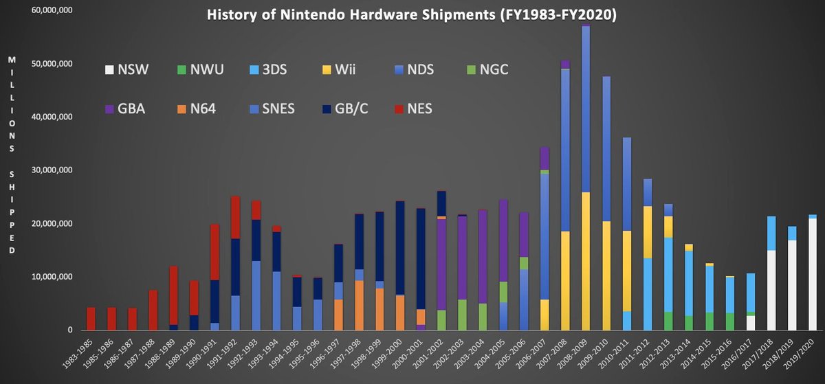 Хотя Switch продается очень хорошо, продажи консолей Nintendo значительно ниже, чем 10 лет назад. В 2008-2010 годах, когда Nintendo одновременно продавала Wii, GBA и DS, выручка от продажи консолей была в два с лишним раза выше.