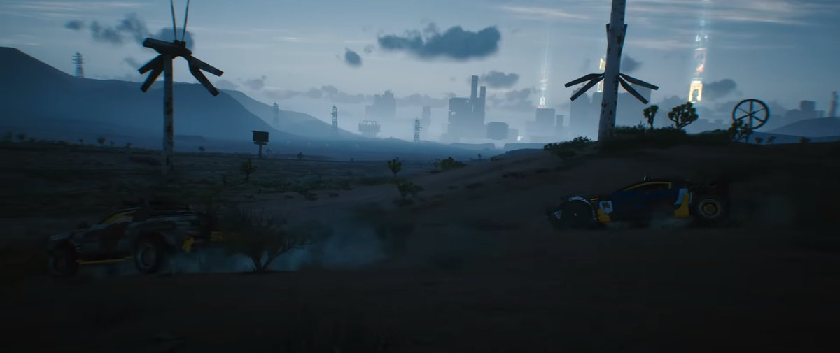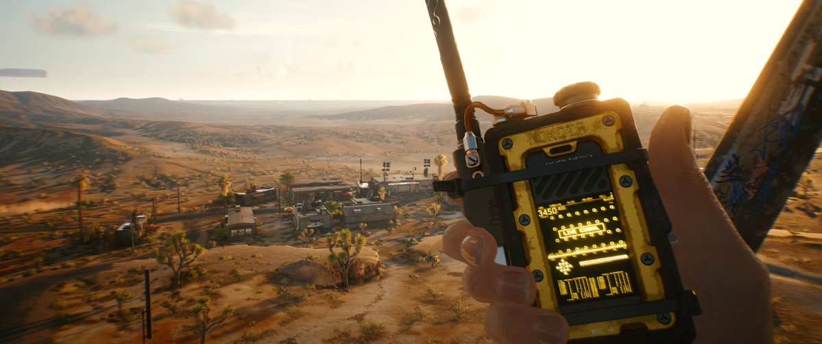 Это сцена из пролога за Ви-Кочевника — он забрался на вышку, чтобы связаться с Джеки. Ви находится в Пустошах, вдалеке на горизонте из пыли проступают небоскребы Найт-Сити. Видимо, туда можно доехать просто по прямой. И нет, мы не знаем, что за штука торчит в левой части кадра.
