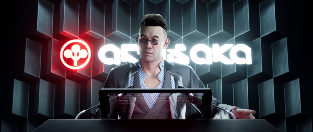 А вот это — Сабуро Арасака, основатель корпорации. Это не архивная съемка: Хотя Арасака родился в 1919 году, ко времени событий Cyberpunk 2077 он еще жив. Вероятно, Сабуро — один из самых старых людей в мире, ему 158 лет.