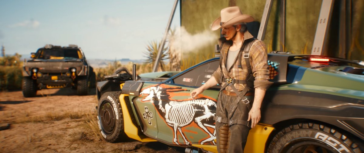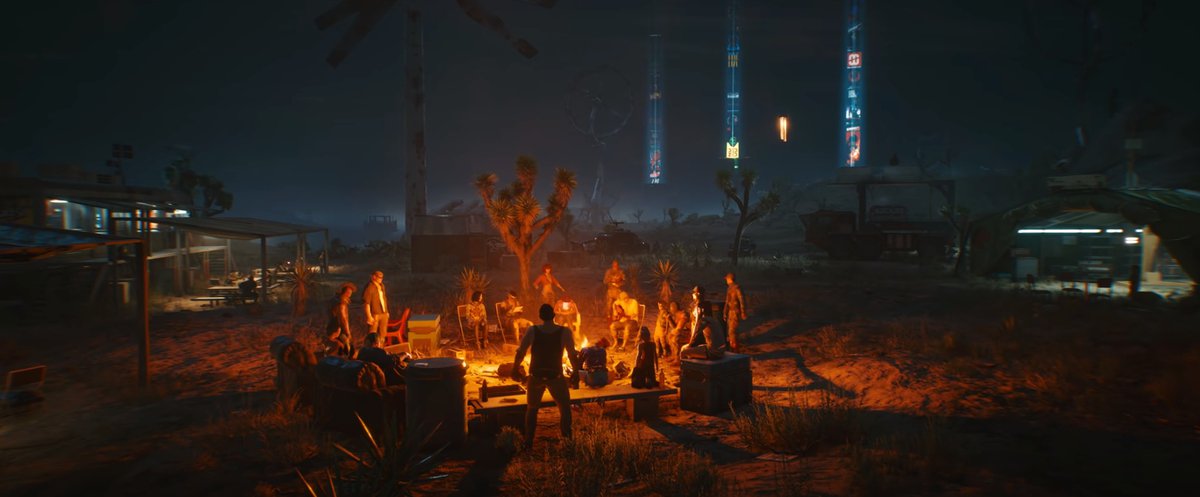 Самое интересное в сцене с расслабляющимися кочевниками происходит на горизонте, в Найт-Сити. Огненный столп в правой части кадра это космический корабль, взлетающий из Orbital Air Space Center, городского космопорта.