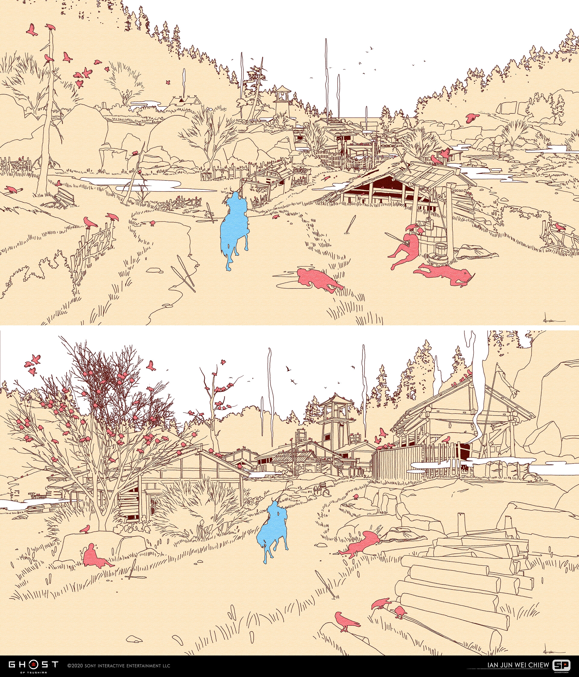 Художники, работавшие над Ghost of Tsushima, начали публиковать концепт-арты и эскизы, созданные во время разработки игры. Чтобы создать виртуальную Японию, ее пришлось тщательно прорисовать: опубликованы сотни концептов персонажей, локаций и сюжетных сцен.