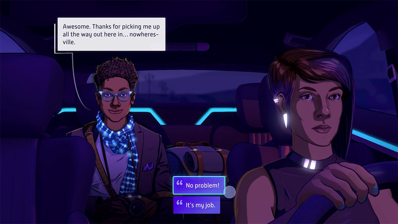 Маленькая, текстовая игра про такси будущего. Киберпанка здесь не особо много и то весь ушёл в визуал. Что не есть плохо. В игре мы выступаем в роли таксиста (или таксистки или как сделать материал не задевающим ничья чувства), который просто ездит по городу, слушает истории и иногда определяет свою жизненную позицию. В этом и вся завязка. Мир спасать не будем, революцию начинать тоже. Игра мощно замахивается на проблемы морального выбора и самоопределения, и диалоги как бы являются главной составляющей игры, но местами ответы главного героя - это просто строчки, которые ни на что не влияют. От этого игра местами кажется пустой. Понравится тем, кто любит долгие беседы и ненапряжённый сюжет.