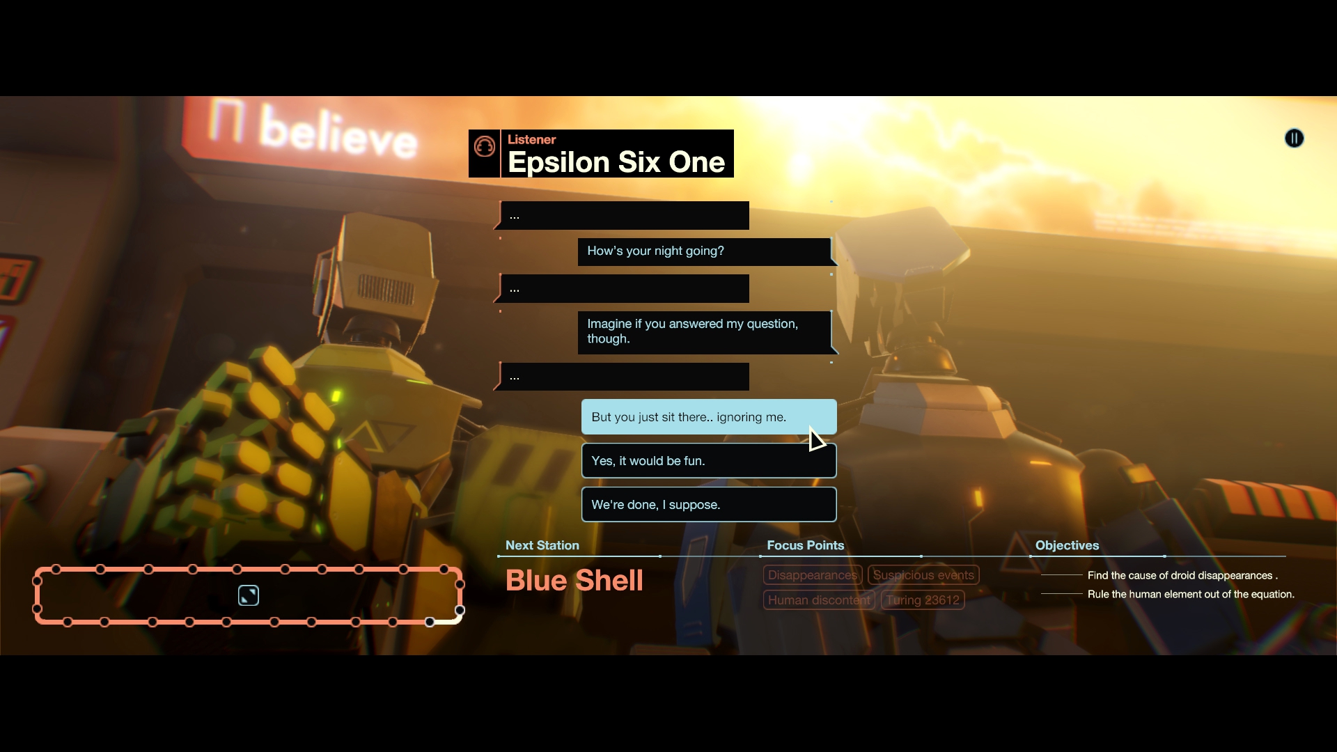 Очень короткая игра, действия которой пройдут для вас, пока вы сидите на одном месте. И разговариваете. И это всё. Выступать мы будем в роли андроида-детектива, которому случайно попадает дело об исчезновении других андроидов. И дело это, нужно попытаться раскрыть, просто разговаривая. Уровень текстовых головоломок максимально прост, сюжетный твист всего один и меня особо за душу не зацепил. Единственный минус: игра только на английском языке, потому что, по словам самих разработчиков '[в игре] мы использовали много каламбура и слов с двойными значениями, которые при переходе на другие языки будут переводиться слишком буквально'.