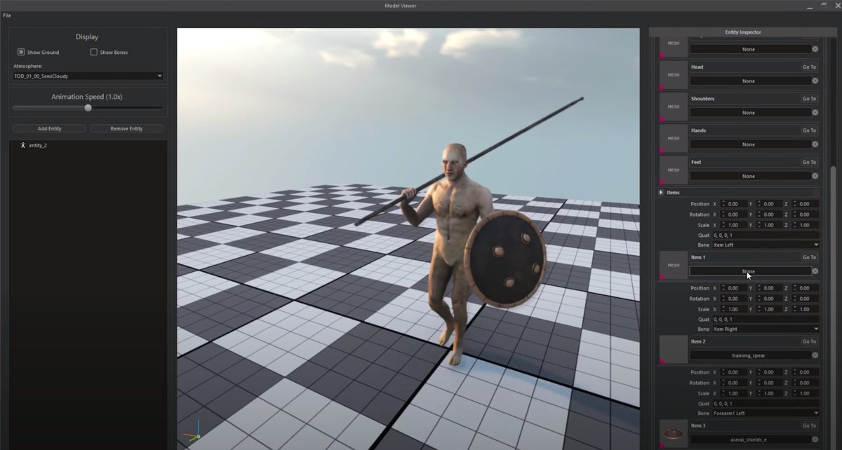 Приложение позволяет посмотреть, как модели и их анимации будут смотреться в игре. Можно загрузить модель, включить ей анимацию, а затем, например, добавить в руки копье и щит, чтобы удостовериться, что никаких глитчей нет.
