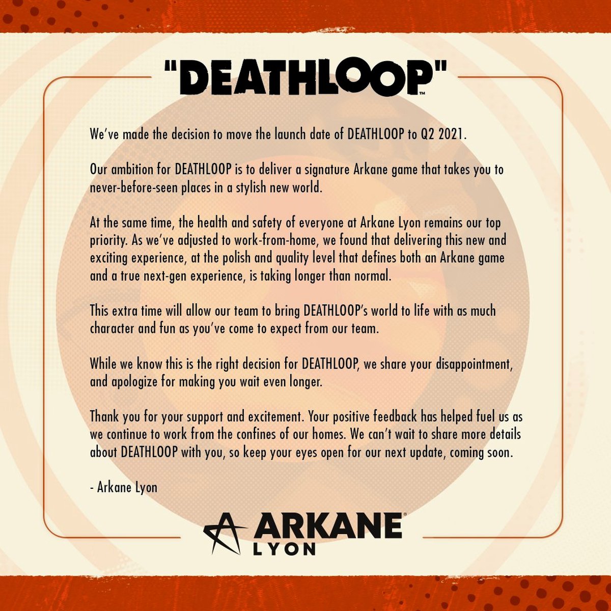 Дополнительное время позволит нашей команде сделать мир Deathloop настолько веселым и характерным, насколько вы и ожидаете от нашей команды. Хотя мы знаем, что приняли верное решение, мы разделяем ваше разочарование и приносим извинения за то, что вам придется подождать дольше, чем ожидалось.