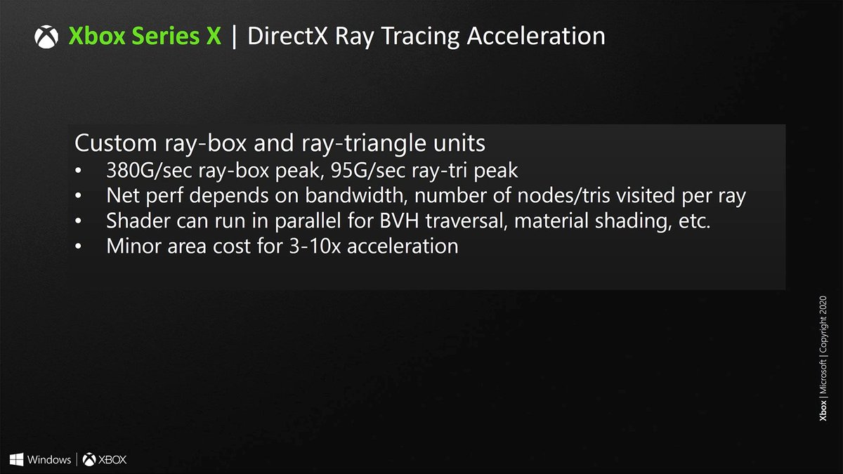 О производительности Xbox Series X при работе с трассировкой лучей известно мало. На презентации раскрыли только пиковую производительность, 95 гигалучей в секунду при работе с треугольниками и 380 гигалучей в секунду при работе с многоугольниками; сравнить ее с характеристиками видеокарт Nvidia не представляется возможным.