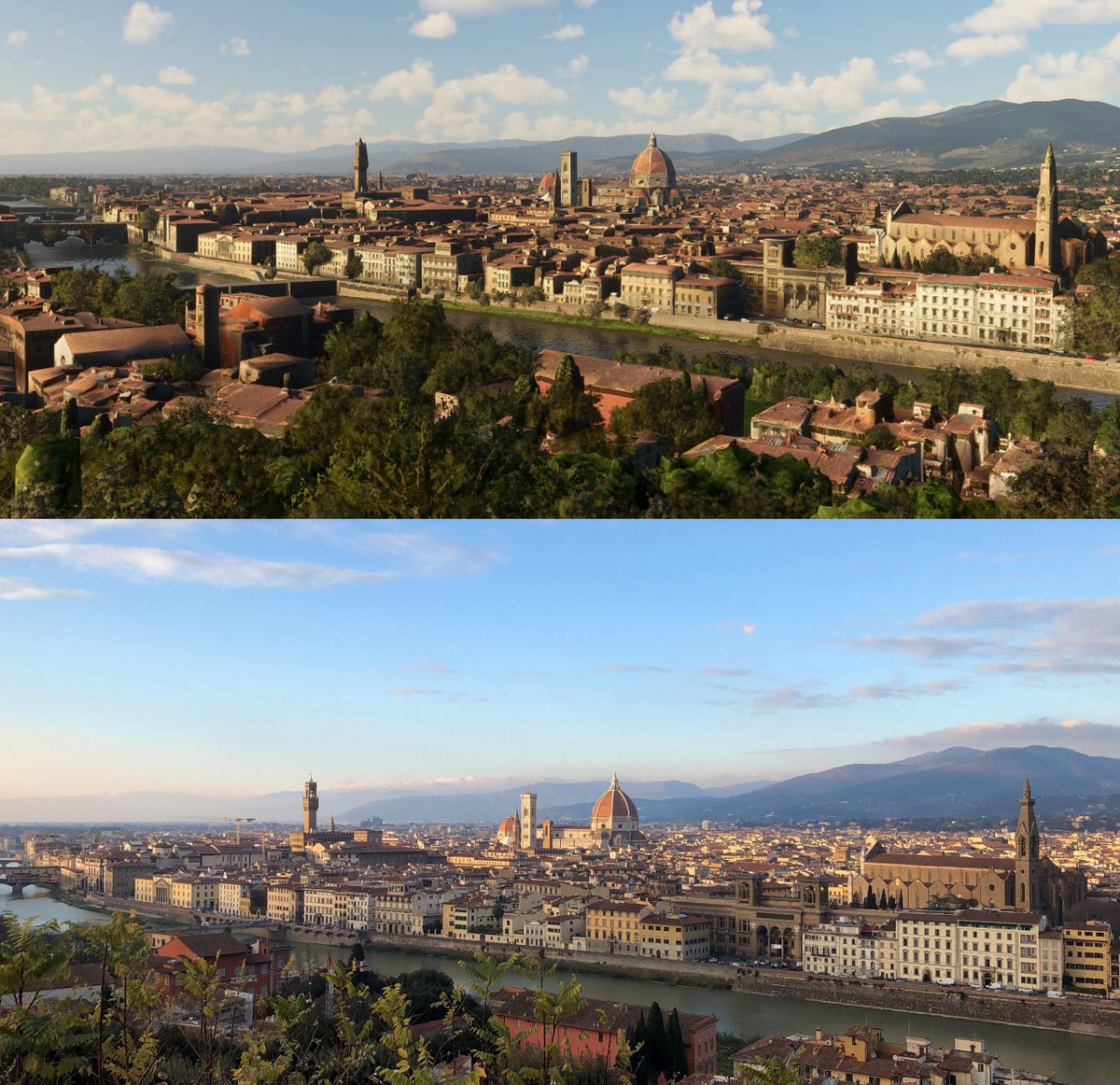 Впрочем, иногда генерация работает и в самом деле неплохо. Вот две Флоренции: верхняя снята в Microsoft Flight Simulator, нижняя фотография сделана реддитором пару лет назад.