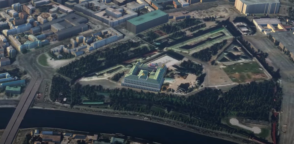 Примерно так же алгоритмы автогенерации обработали комплекс на Поклонной горе. Вместо огромного шпиля в центре площади стоит маленький домик — от шпиля осталась только тень. Впрочем, основные здания комплекса хотя бы сохранили свою форму.