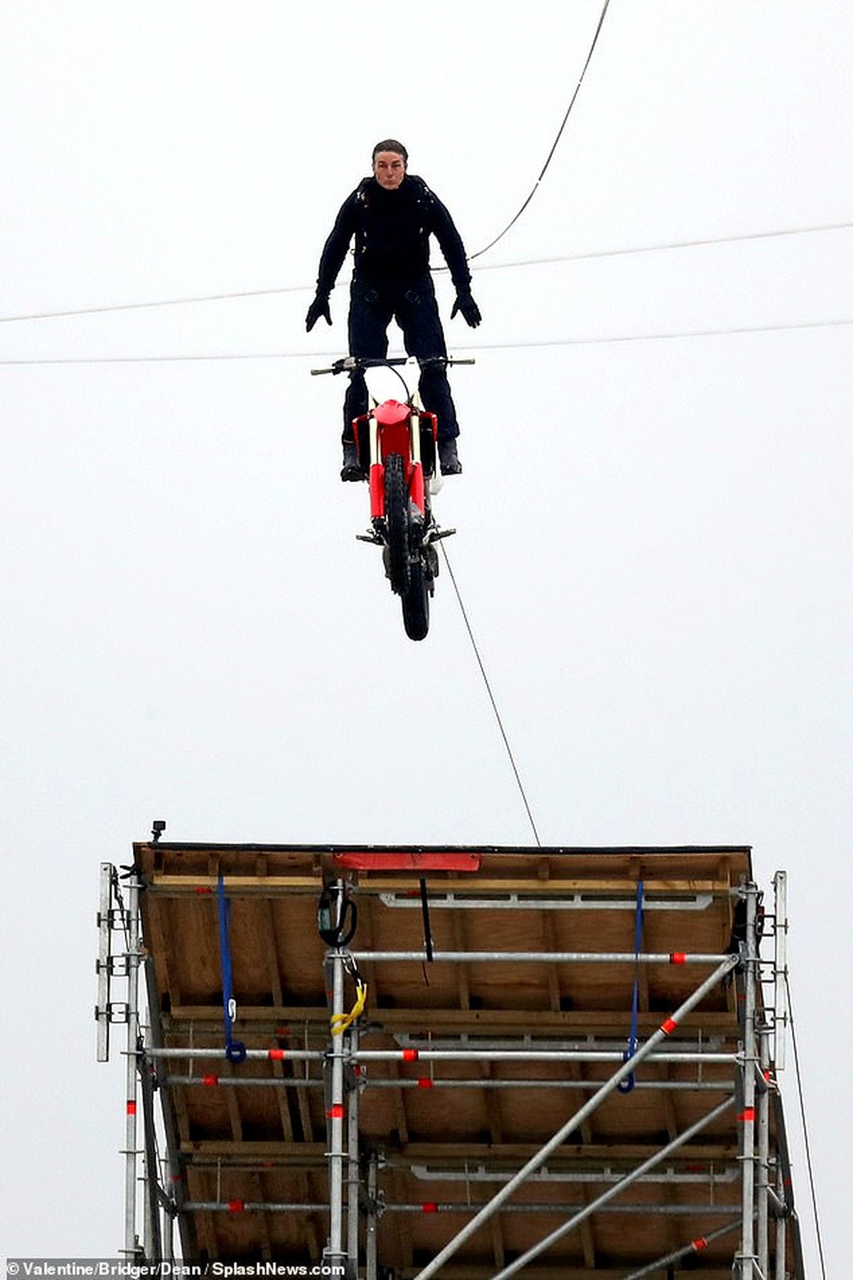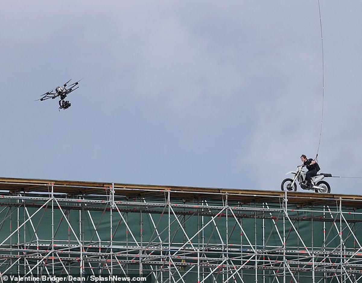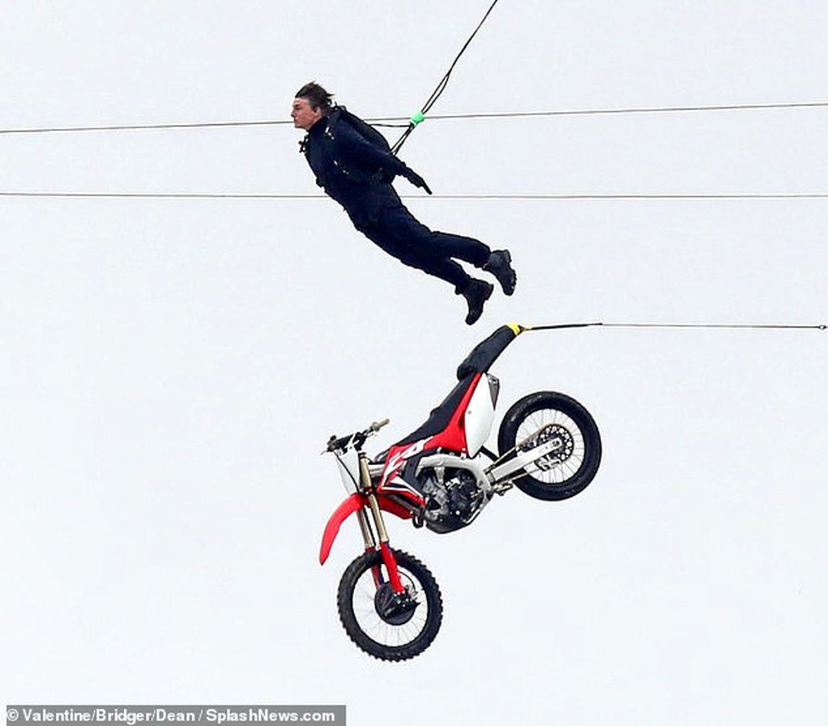 На фотографиях хорошо видно, что Том Круз по-прежнему выполняет трюки своих персонажей самостоятельно. В финале сцены он спрыгивает с мотоцикла; тот летит вниз, а актер повисает на страховке.
