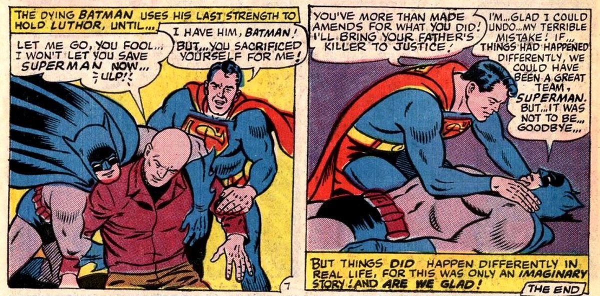На самом деле знакомые нам Бэтмен и Робин никогда не дрались — во всяком случае, так, как это показано в комиксе. В World's Finest №153, вышедшем в 1965 году, речь шла об одной из альтернативных вселенных DC: это был мир, где отца Бэтмена убил не грабитель, а Супермен.
