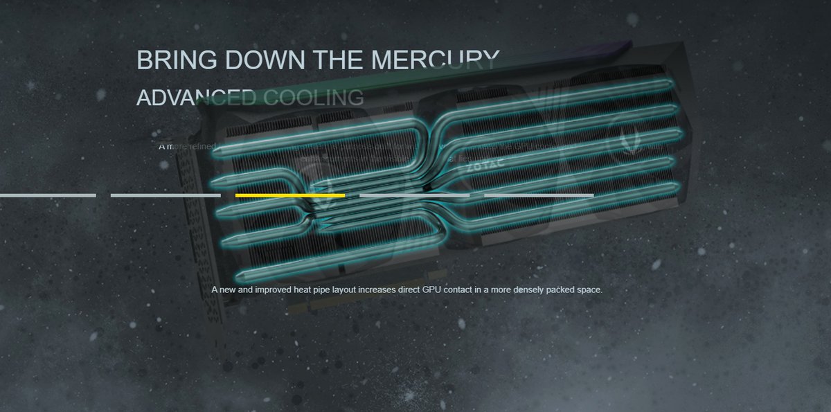 Топовую GeForce RTX 3090 в Zotac оснастят тремя вентиляторами. В отличие от референсного дизайна Nvidia, здесь вентиляторы расположены только на одной стороне корпуса. Судя по одному из слайдов, под вентиляторами расположена система тепловых трубок.