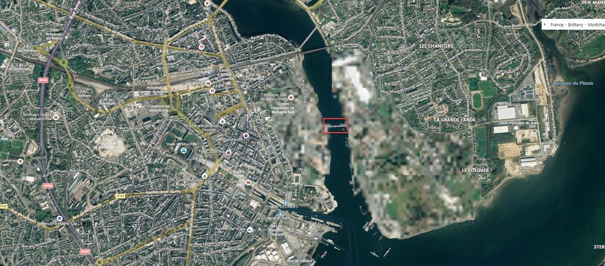 Например, в игре можно увидеть французскую военную базу в Лорьяне. На спутниковых снимках Bing Maps база очень сильно пикселизирована — помимо контуров дорог, проложенных самим сервисом, разглядеть почти ничего нельзя.