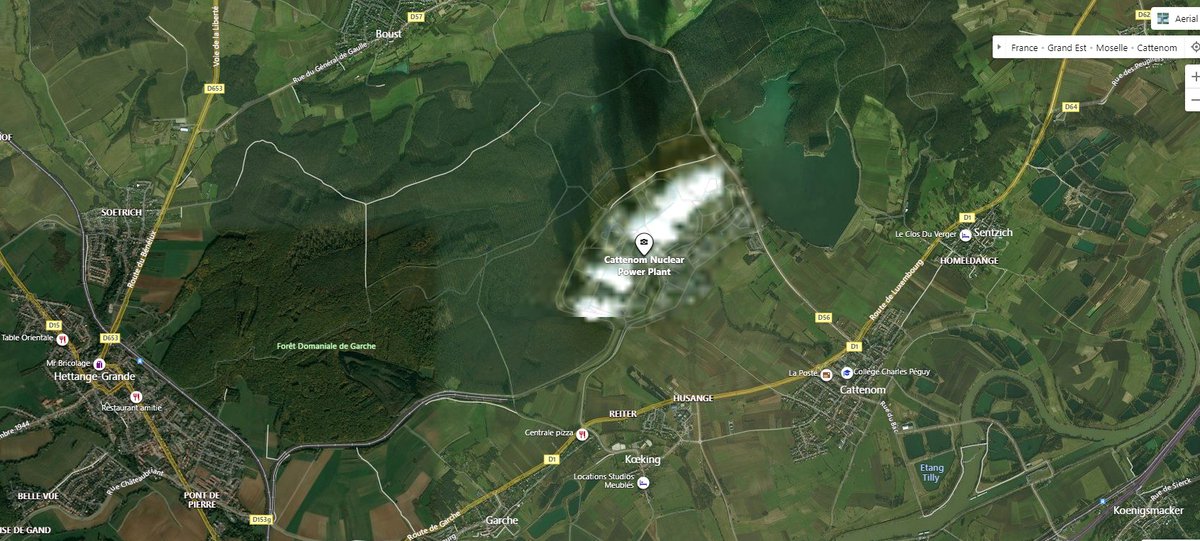 Другой интересный пример это атомная электростанция Каттеном, расположенная в Лотарингии. На спутниковых снимках АЭС практически не видна: во-первых, ее окрестности тоже сильно пикселизированы; во-вторых, станцию закрывают облака пара из градирен.
