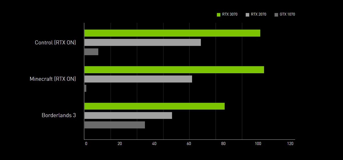 О производительности в разрешении 4К ничего не сообщается, официальные тесты Nvidia проводились в разрешении 1440p. Здесь GeForce RTX 3070 примерно в полтора раза быстрее GeForce RTX 2070 и может обеспечить свыше 100 кадров в секунду в Control и Minecraft.