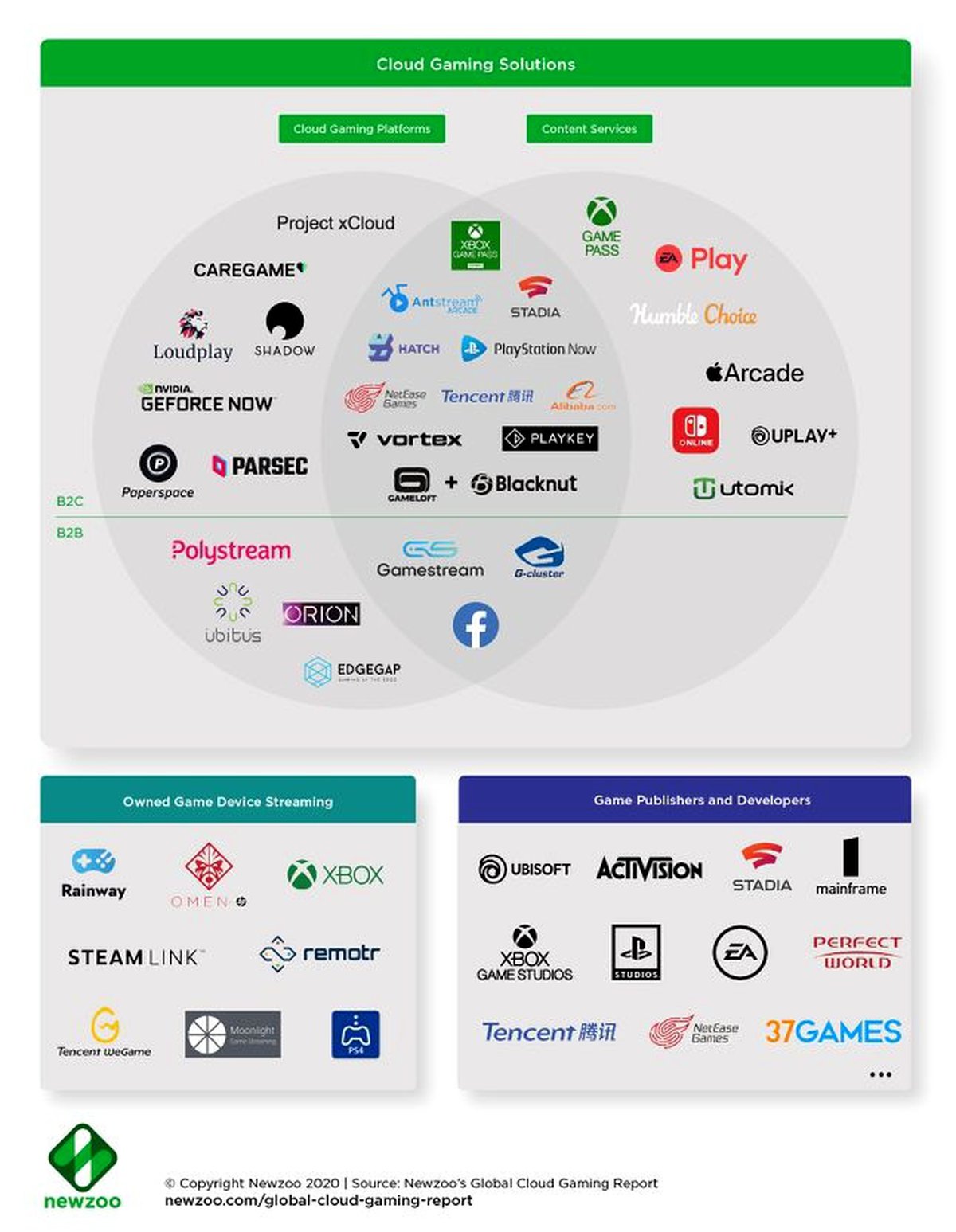 Прогнозов о лидерах рынка Newzoo не дает. Сейчас облачные игровые сервисы есть у большей части крупных игровых компаний: помимо Microsoft их развивают Sony, Nvidia и Google, соответствующие исследования проводят в Electronic Arts и Ubisoft.