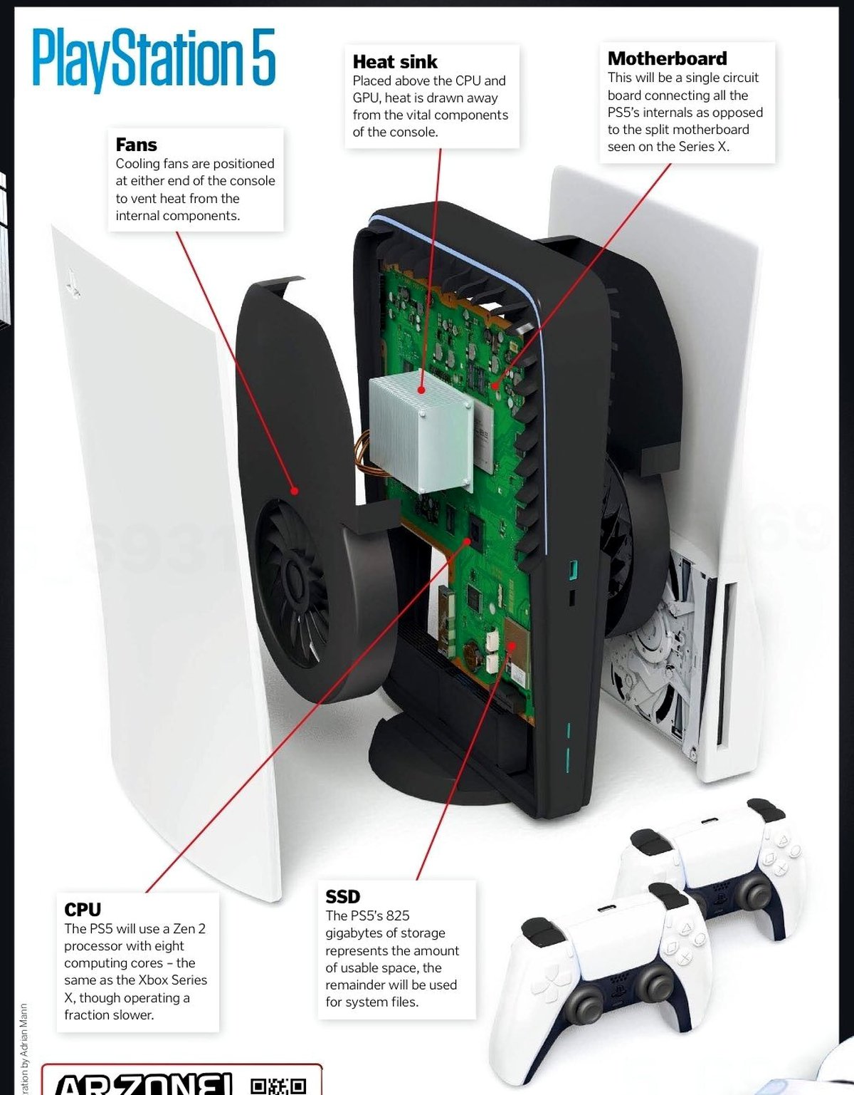 Sony пока не рассказывала, как PlayStation 5 устроена внутри: консоль показывали только снаружи. Адриан Манн из журнала How it Works попробовал предположить, что срывается внутри корпуса обычной версии консоли, идущей в комплекте с Blu-ray приводом.