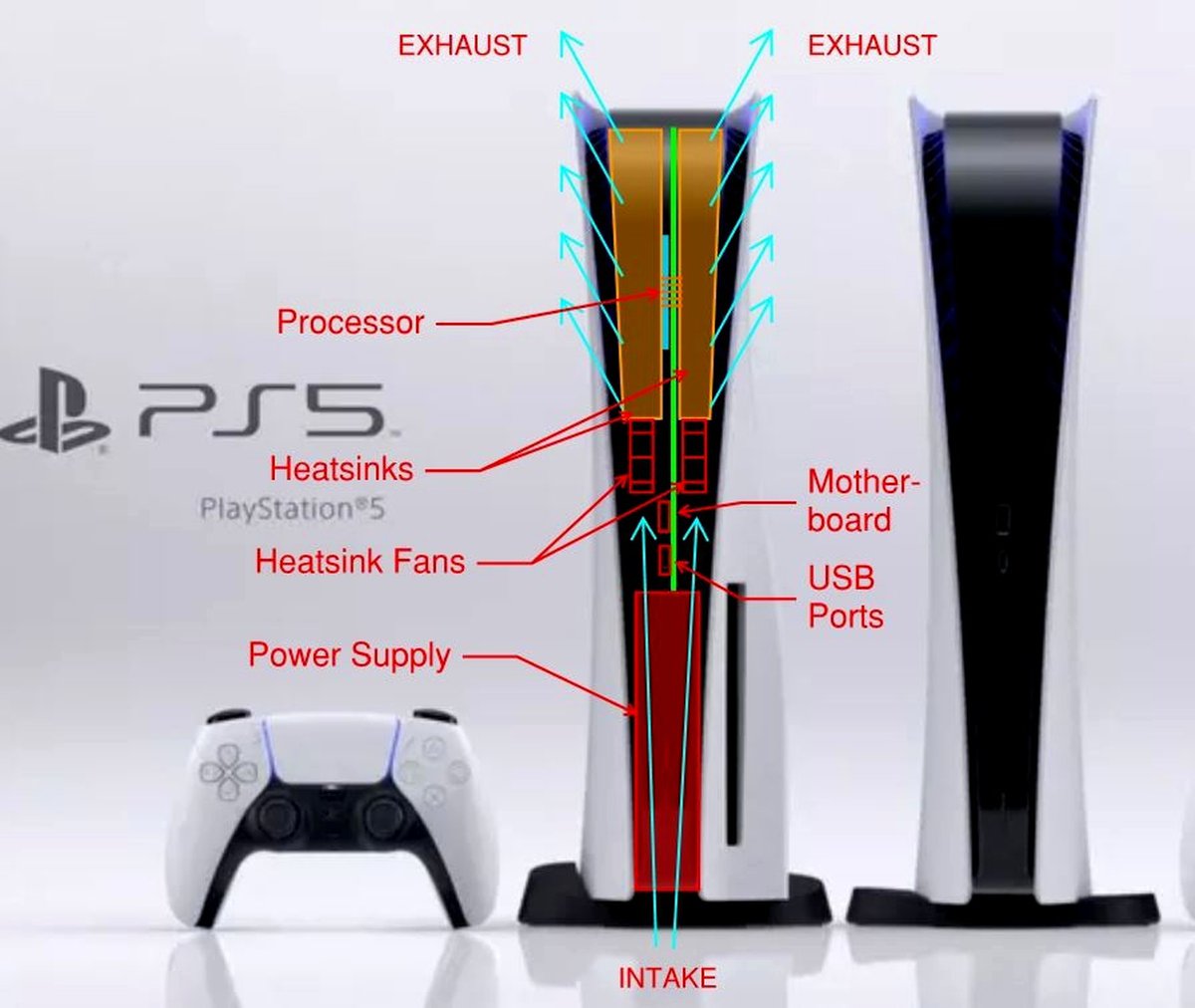 Консоль, считает журналист, будет оснащаться двумя вентиляторами, расположенными по бокам устройства. Это выглядит правдоподобно: корпус PlayStation 5 действительно устроен так, что вентиляционные отверстия находятся и слева, и справа.