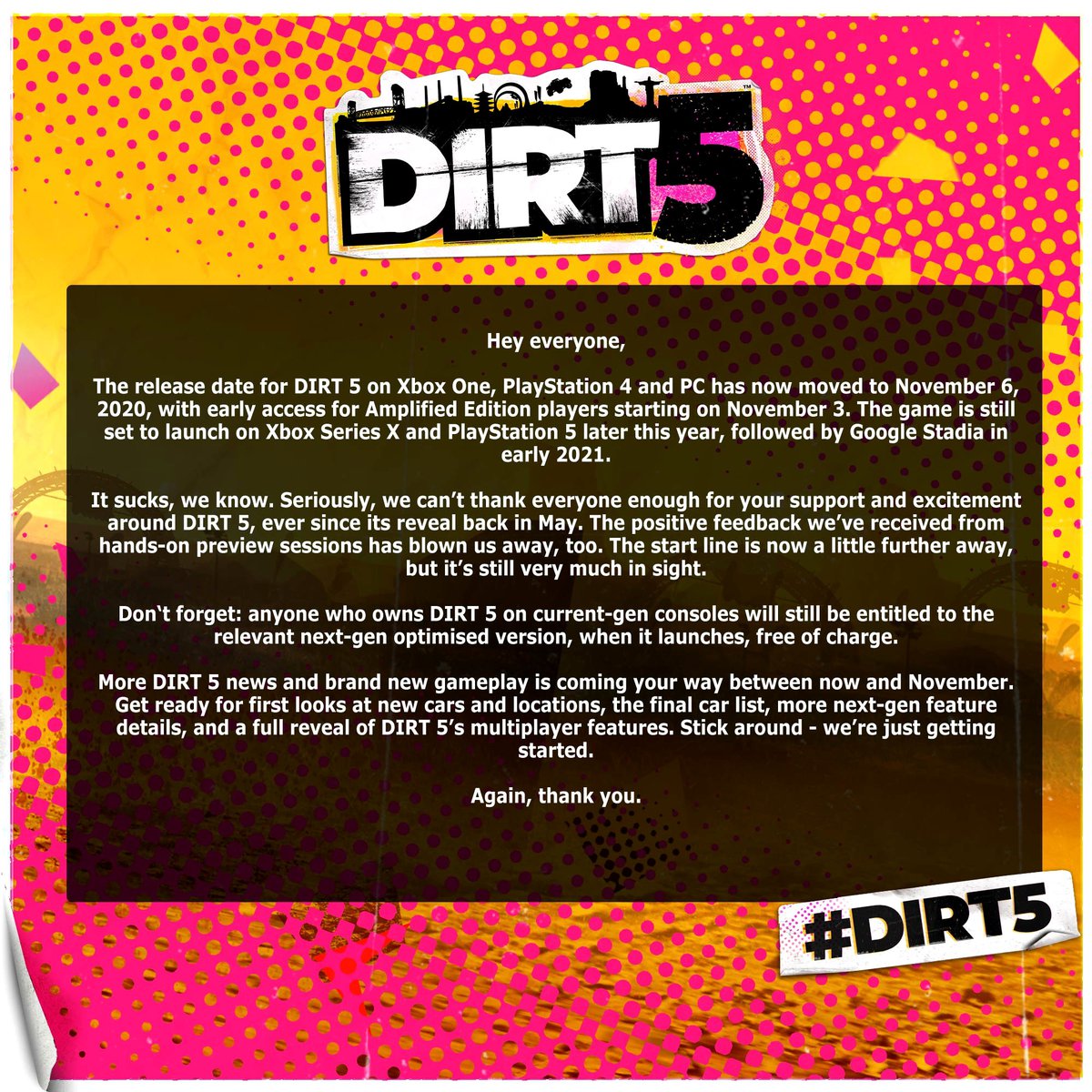 Выпуск DiRT 5 на консолях нового поколения все еще запланирован на 2020 год. Покупатели версии для нынешних консолей смогут обновиться бесплатно.