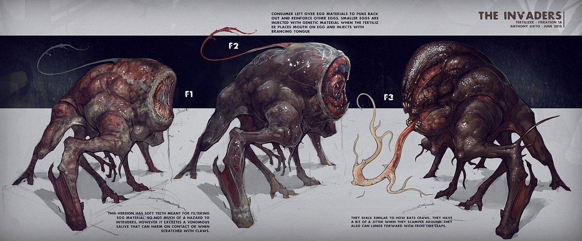 А существо с концепт-арта ниже отвечало за размножение более крупных монстров. Оно было слепо, но реагировало на движения и температуру: это помогало отыскивать яйца других существ, оплодотворять их и некоторое время вынашивать в желудке.