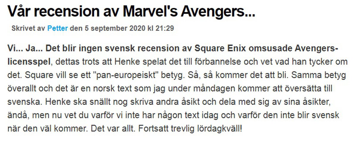 Компания Square Enix, издающая Marvel's Avengers, манипулировала рейтингом игры на Metacritic с помощью соглашения, заключенного с как минимум одной сетью игровых изданий. Главный редактор шведской версии GameReactor Петтер Хегевалль рассказал, что вся сеть будет считать официальным лишь один обзор игры, написанный норвежским подразделением.