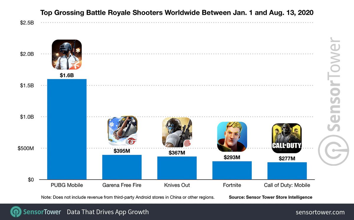 Как отмечают аналитики, сейчас выручка мобильной версии PUBG гораздо выше, чем у конкурентов. К примеру, с 1 по 13 августа — это день, когда Fortnite удалили из App Store и Google Play — PUBG Mobile заработала $1.6 миллиарда.