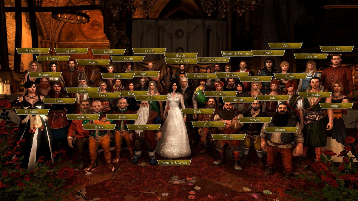 А вот — достаточно старый скриншот с практически полным списком персонажей, присутствующих на свадьбе: от Саскии и Плотвы до Абигайль из первого The Witcher.