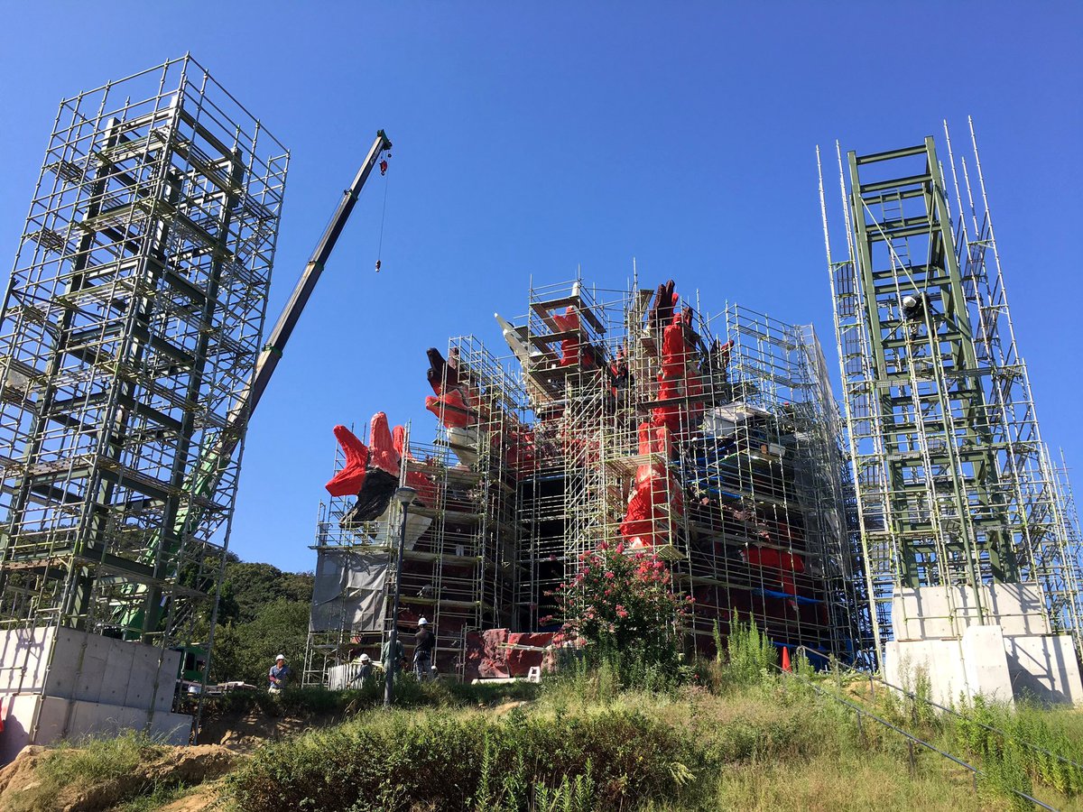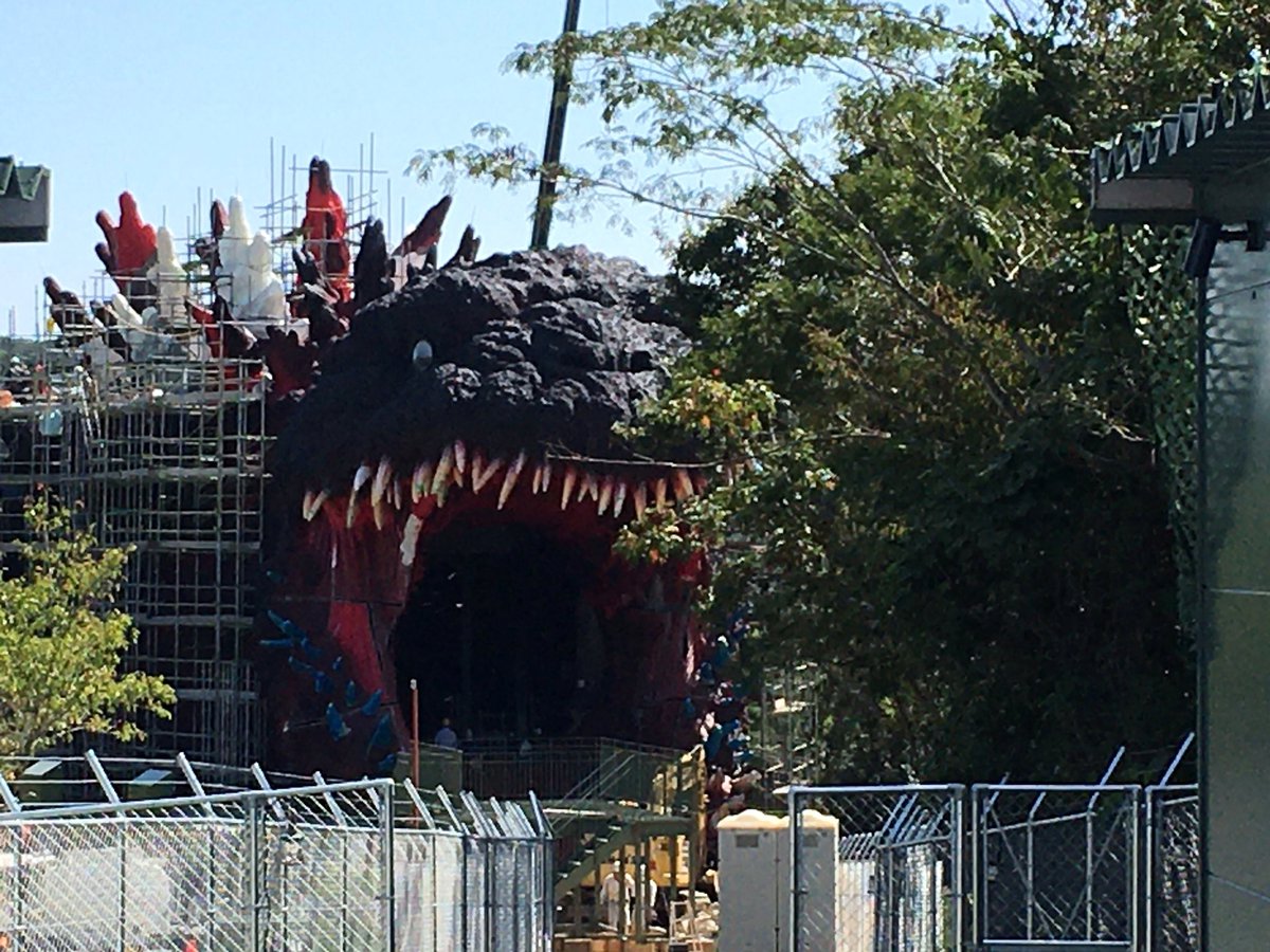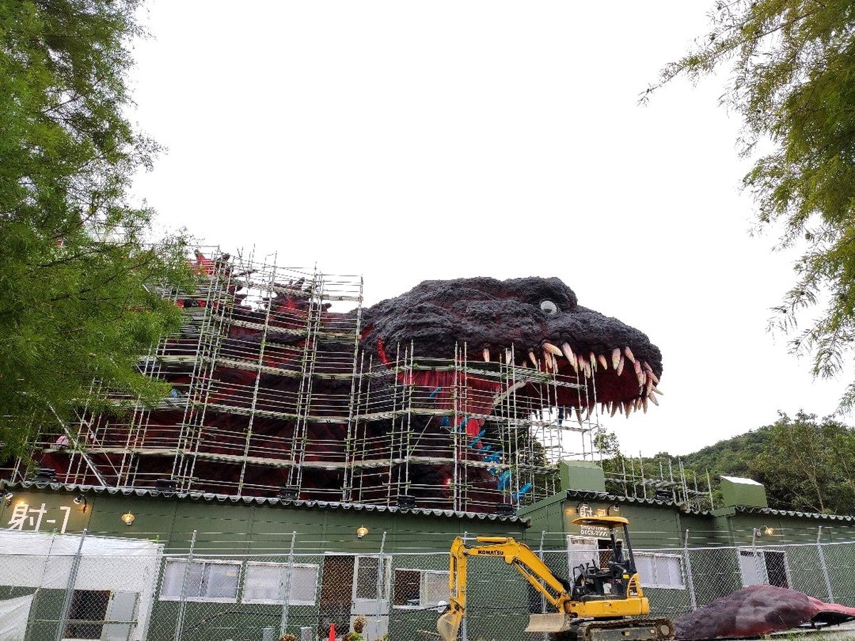 Вот несколько фотографий со строительной площадки Годзиллы. Тут можно увидеть не только переднюю, но и заднюю часть реплики, где воссоздан гребень монстра.