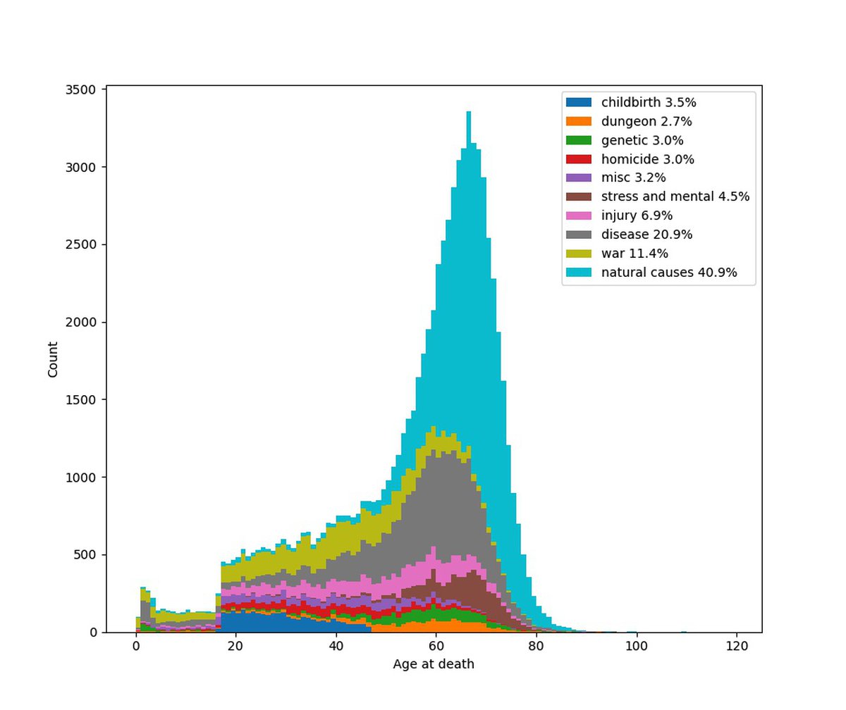 Оказалось, что где-то до 50-летнего возраста персонажи чаще всего гибнут либо от ран, либо во время войны. Затем на первое место ненадолго выходят болезни, а потом резко растет доля естественных причин: персонажи начинают быстро стареть.