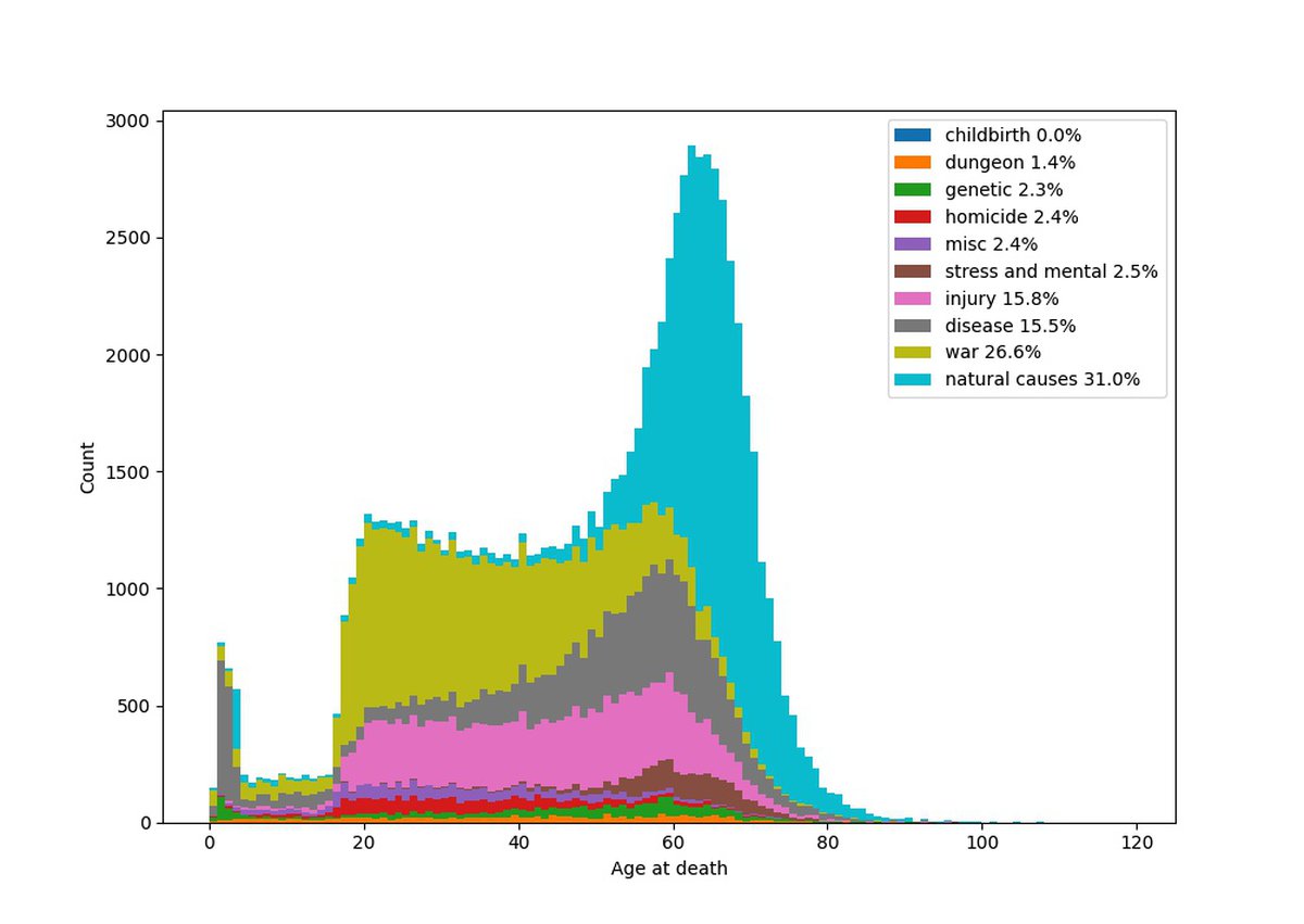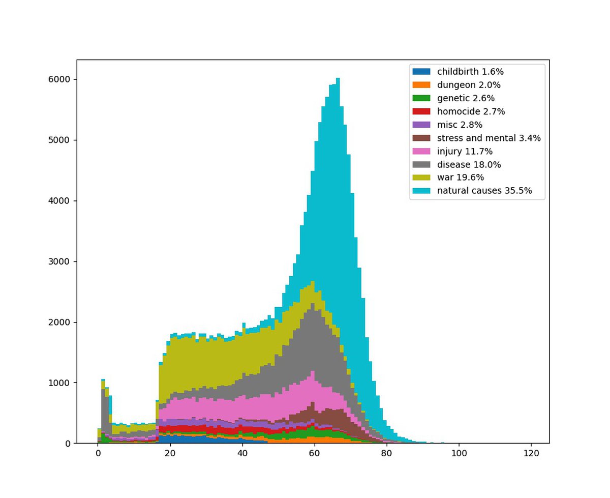 В результате сбора данных получился следующий график. По оси X здесь показан возраст гибели персонажей, по оси Y — количество персонажей, погибших в этом возрасте за 600 внутриигровых лет. Цветом обозначена причина гибели.
